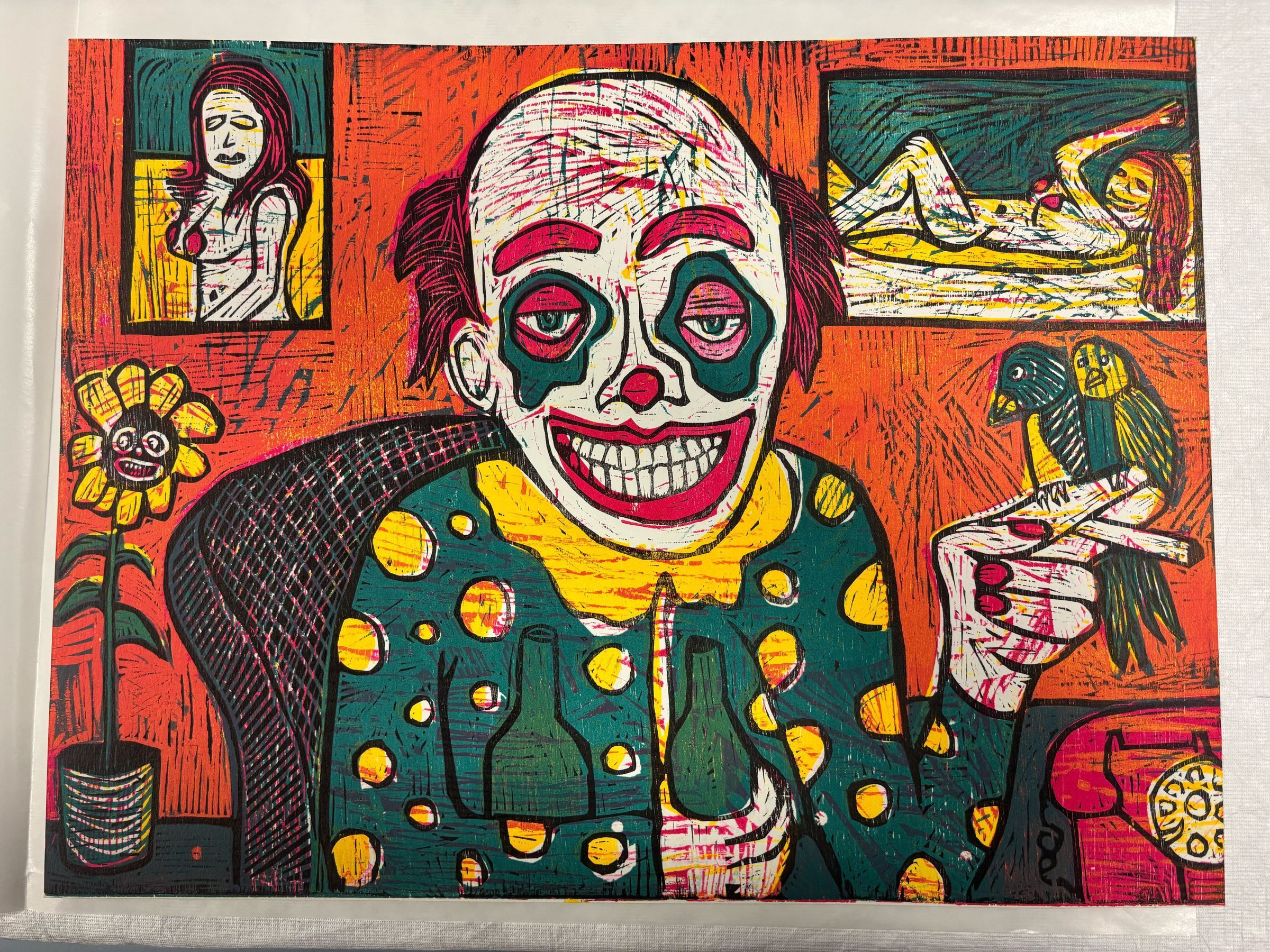 Large, rectangular, horizontally oriented featuring an image with a seated clown holding beers in one arm and a cigarette and bird in the other. Beside him a sunflower and telephone can be seen and two nude female figural paintings are behind him.Collection