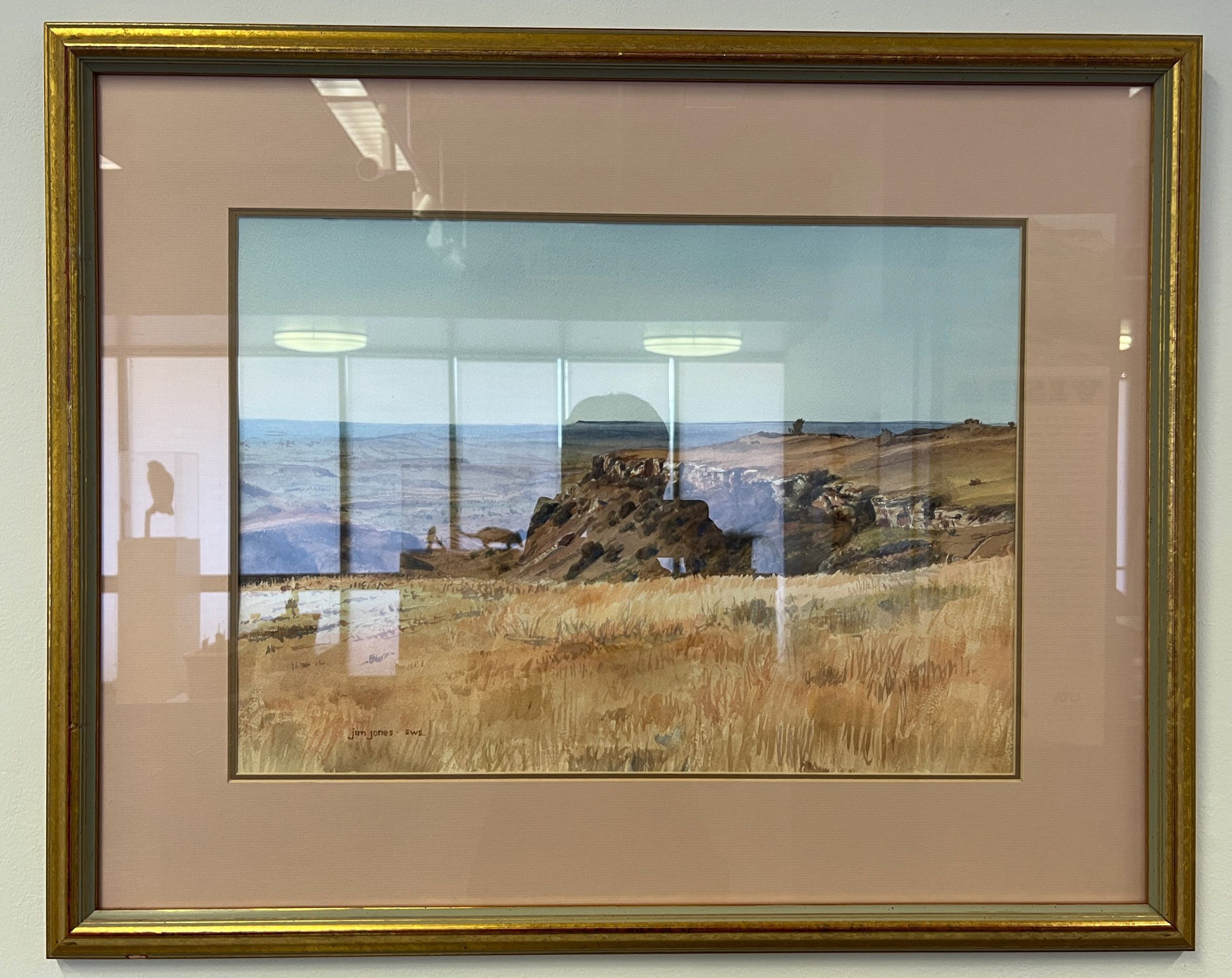 Large, horizontally oriented, watercolor landscape of a grassland canyon and its surrounding plain. It is set under glass, within a pale pink mat and wood frame painted gold.Context