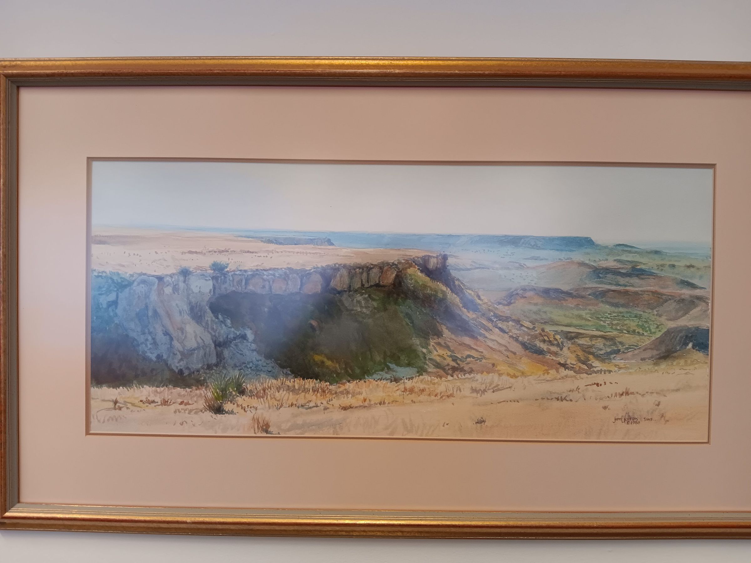 A Caprock Vista that depicts rocky outcrops in a landscape with grassland and scrub brush around the surrounding areas throughout the piece. Hues of gray, red, green, yellow. Vista is on proper right jetting out to the center of the work. The vista here is the main focal point.Collection