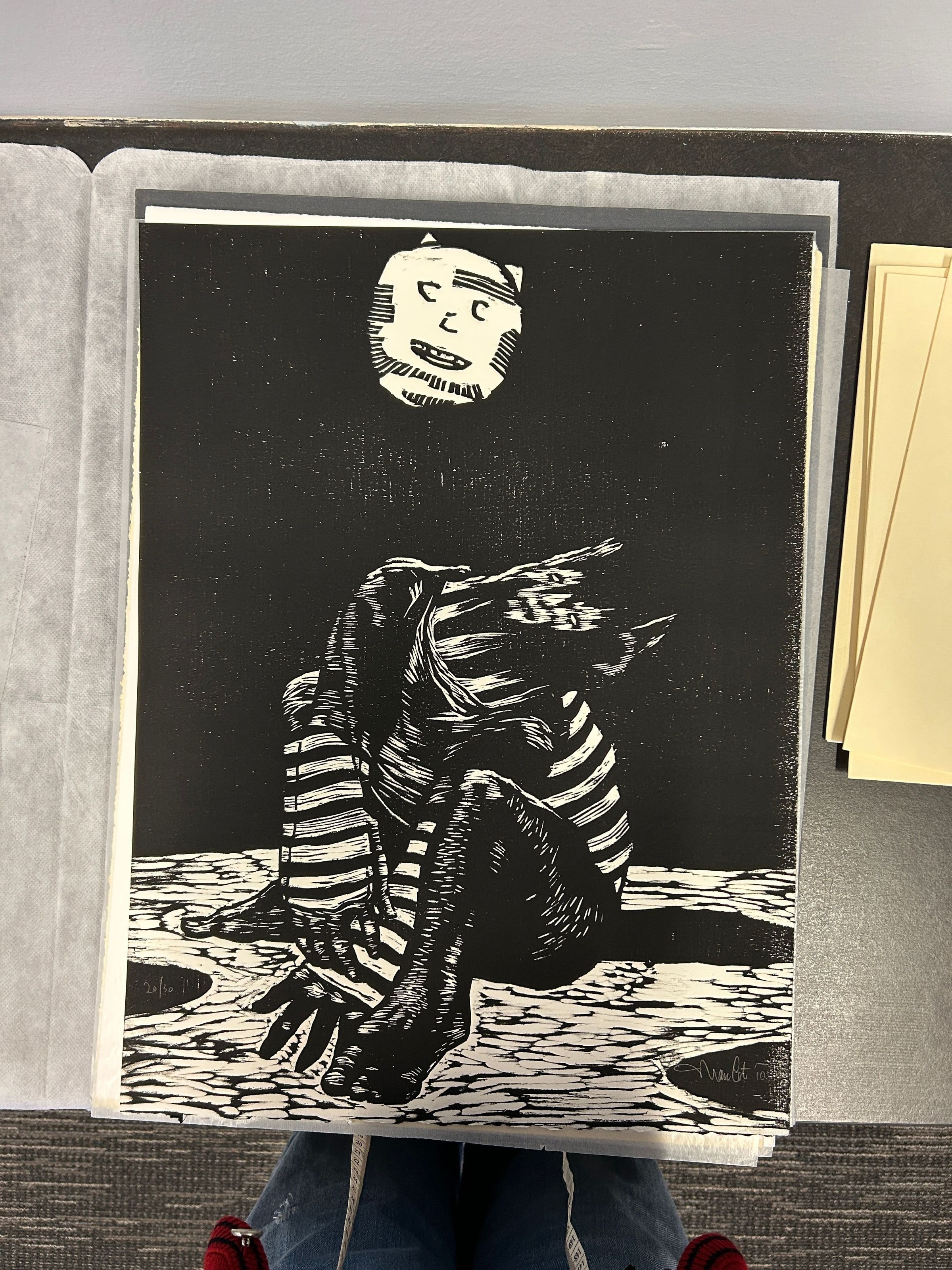 A large black and white print of an anthropomorphic cat and a cat-shaped moon.Collection