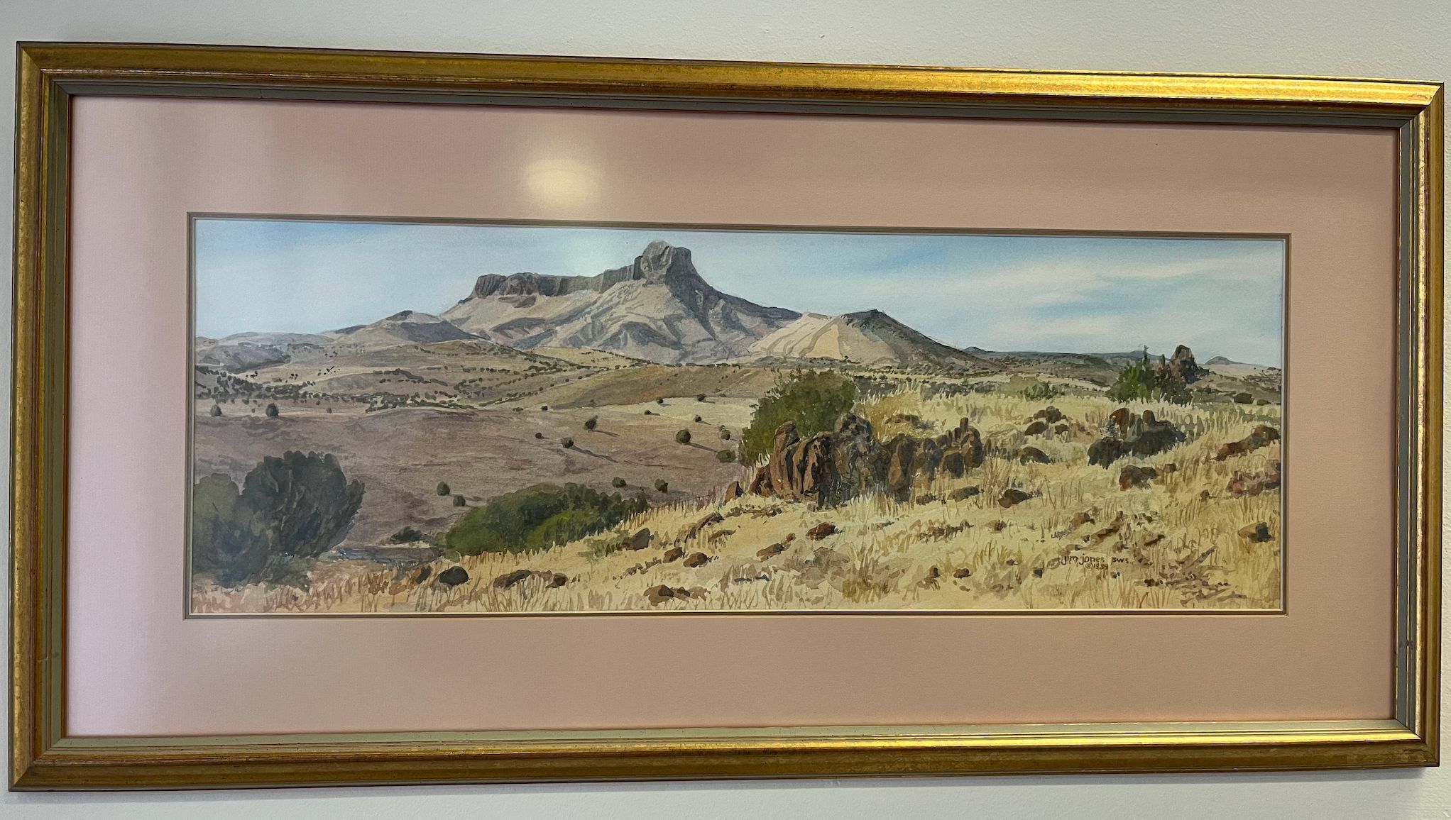 Large rectangular watercolor on paper, horizontal orientation depicting a mountain vista in earth tones.Collection