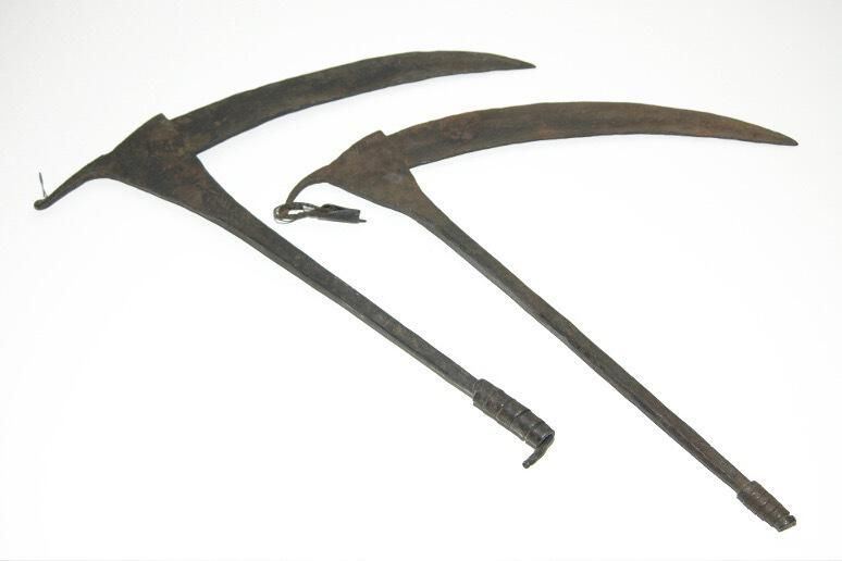 Forged iron sickle-form tool with long, thin handle and a long, curved bladeCollection
