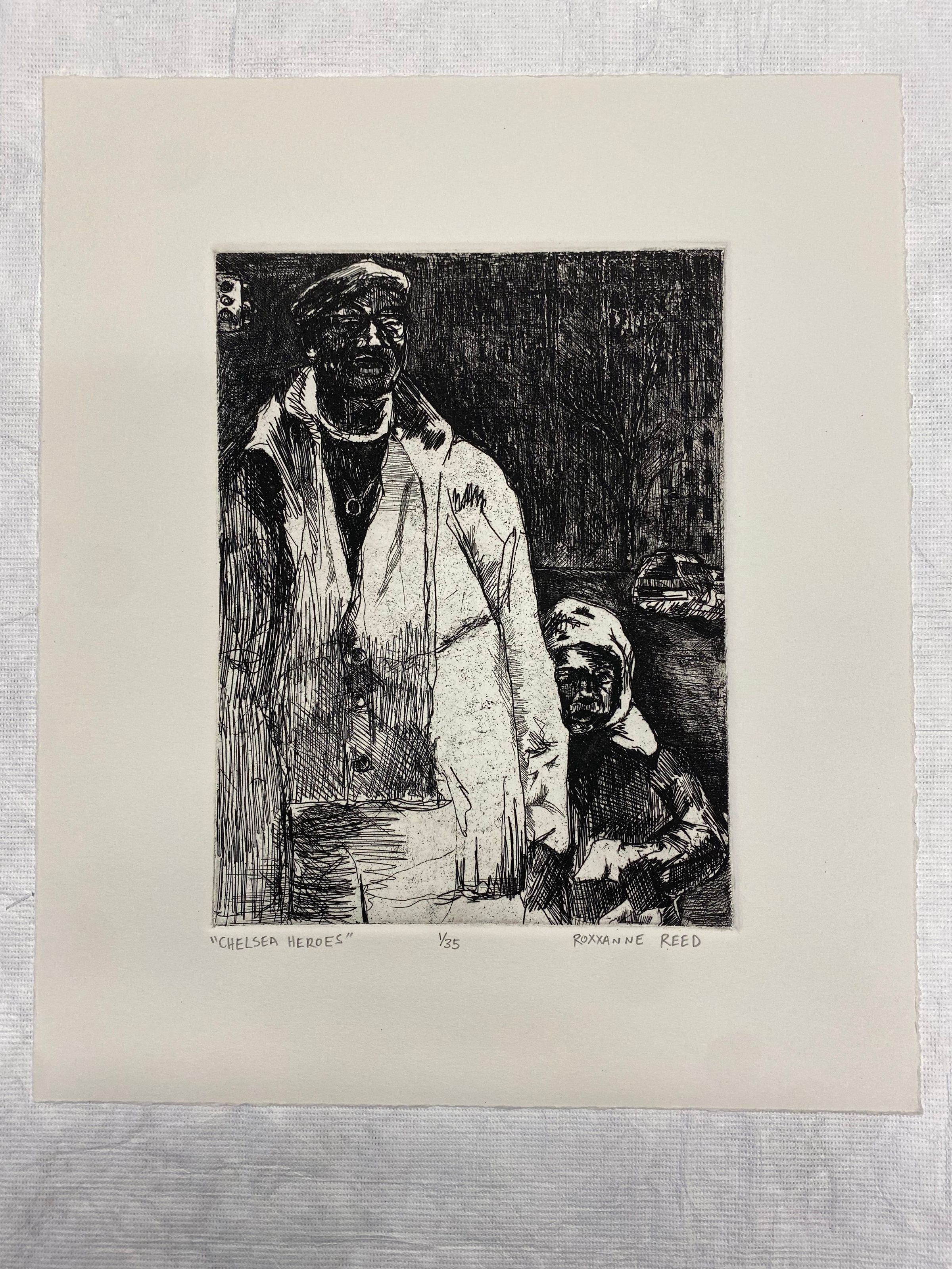 Medium-sized vertically oriented print of two figures standing outdoors in front of a city street. Both are clothed in heavy jackets. The larger figure to the right is a male wearing a hat, glasses, and a ring-shaped item on a necklace. The smaller figure is a child clutching the left side of the male figure with the hood of the jacket pulled over its head. To the right of the male figure's head is a small stop light and to the left of the child's head is a parked car and a tree. In the background, a series of repeated rectangles emulates a building.