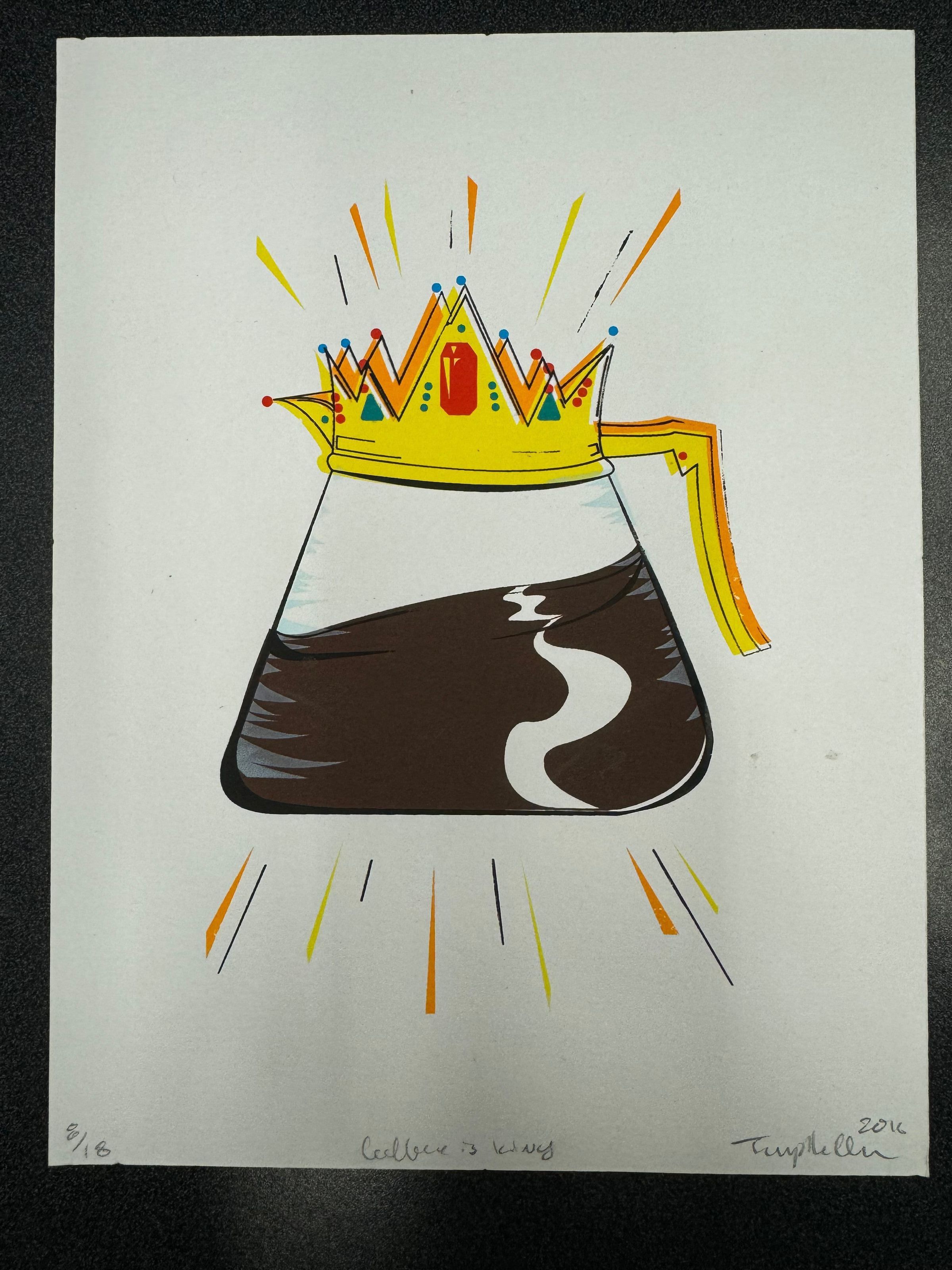 A small, vertical, rectangular print with a cartoon half-full coffee pot with a yellow brown decorated with jewels. Top and bottom of the subject have yellow, orange, and black lines. Pot is outlined with light blue shading. Edition, title, artist signature, and date on the bottom of the front of the print.