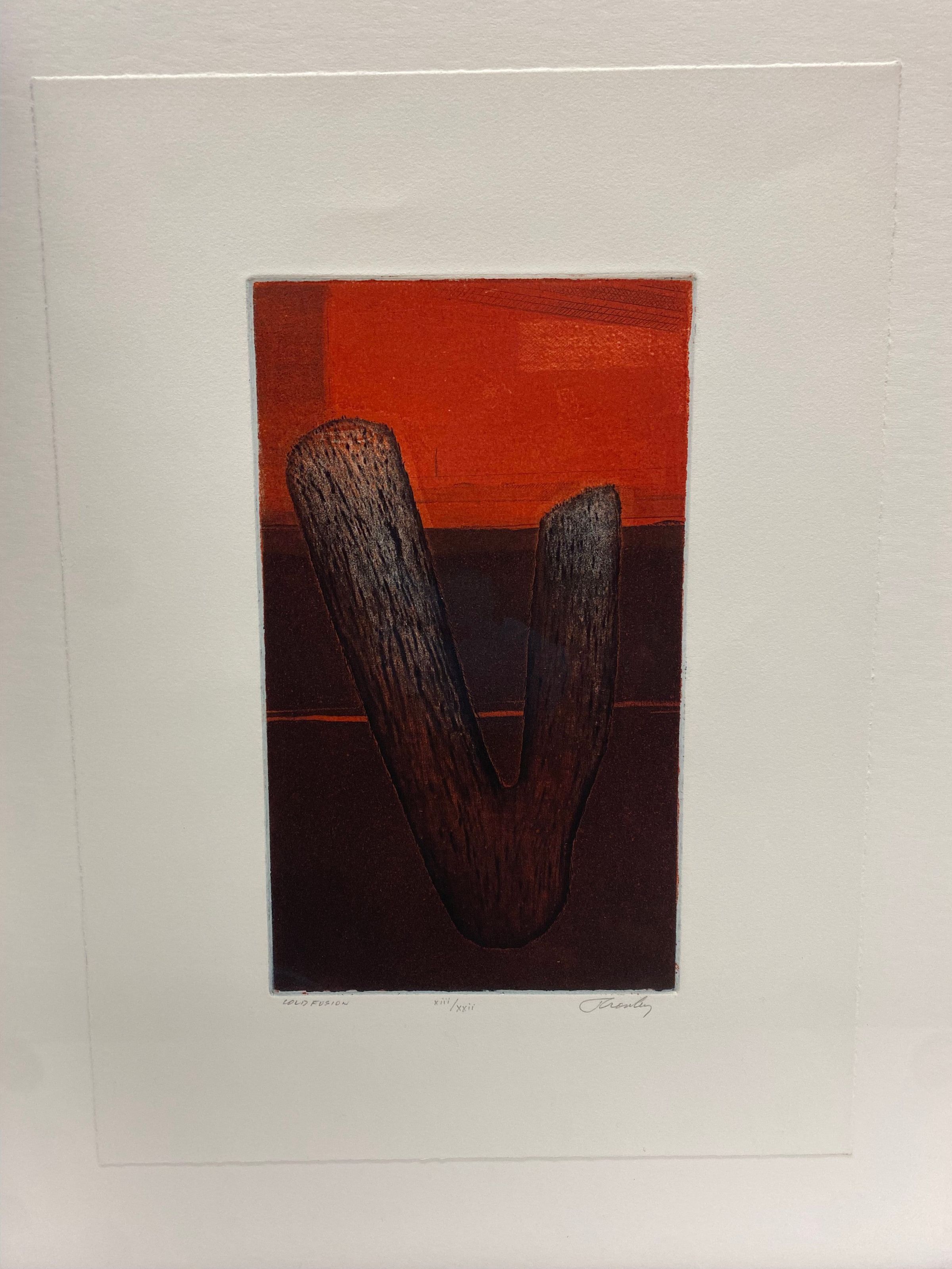 Medium intaglio printed image vertically oriented and centered on cotton rag paper with deckled edges. The main subject is a central V symbol against a red and black background with etched lines for texture as well as thatched lines in the top right region above the symbol.Collection