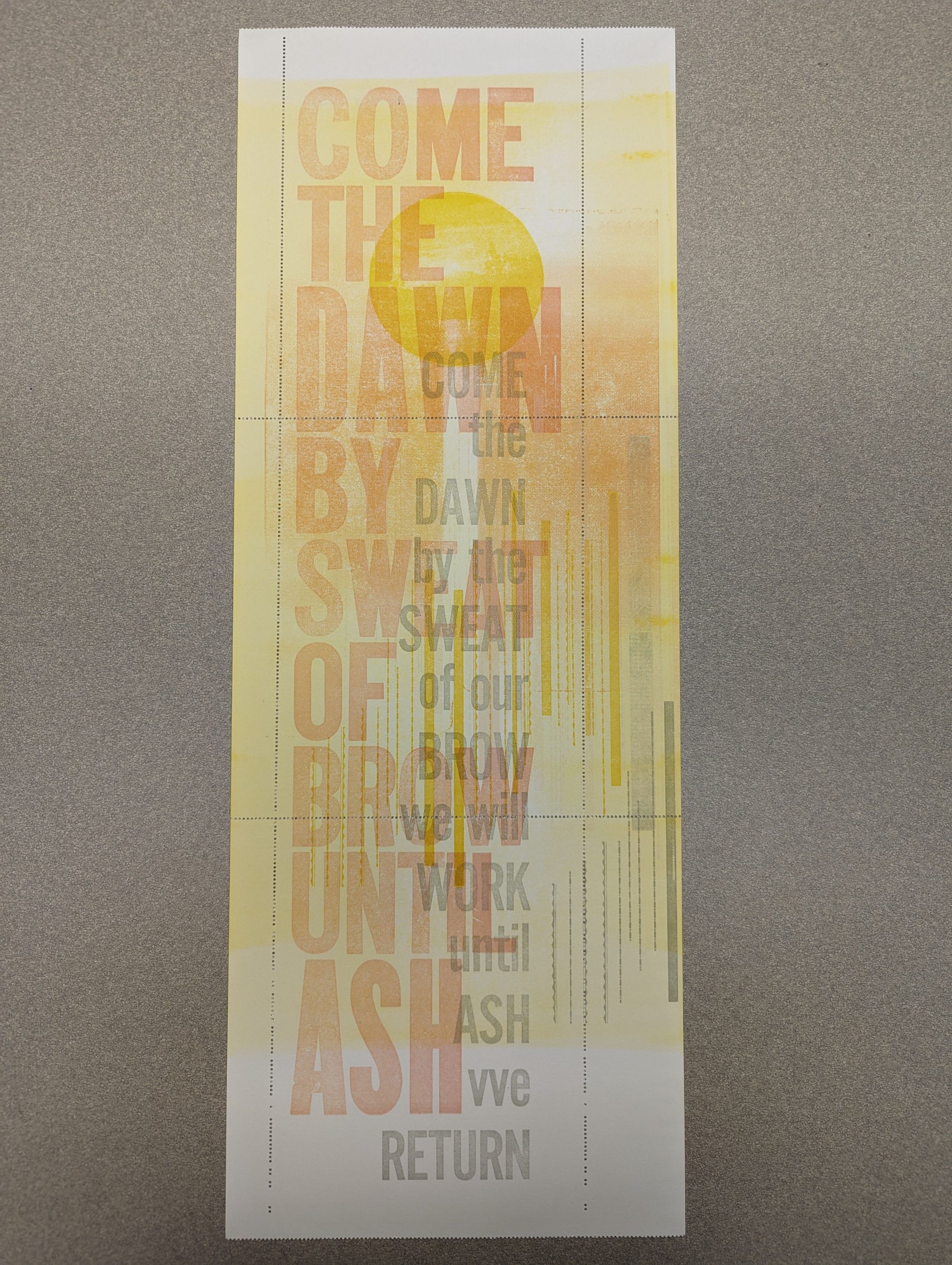 A long vertical print. The background is a yellow and orange design with a large golden sun towards the upper half. Printed down the page in thick red text is "Come the dawn by sweat of brow until ash." Printed in smaller gray text is "Come the dawn by the sweat of our brow we will work until ash we return." The page is made up of several non-separated postcards, so it has dotted lines punched out of it.