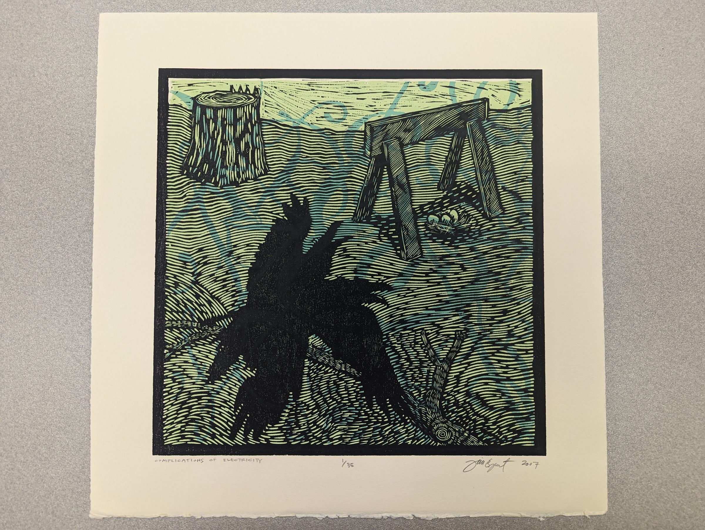 A stylized square-bordered print showing a field containing a stump, a fallen tree, and a wooden stand over a bird's nest of eggs. In the foreground is the silhouette of a raven (or ravens); one head is visible with many pairs of wings overlapped. The background is a pale green with swirling arcs of blue-green running throughout the print.Context