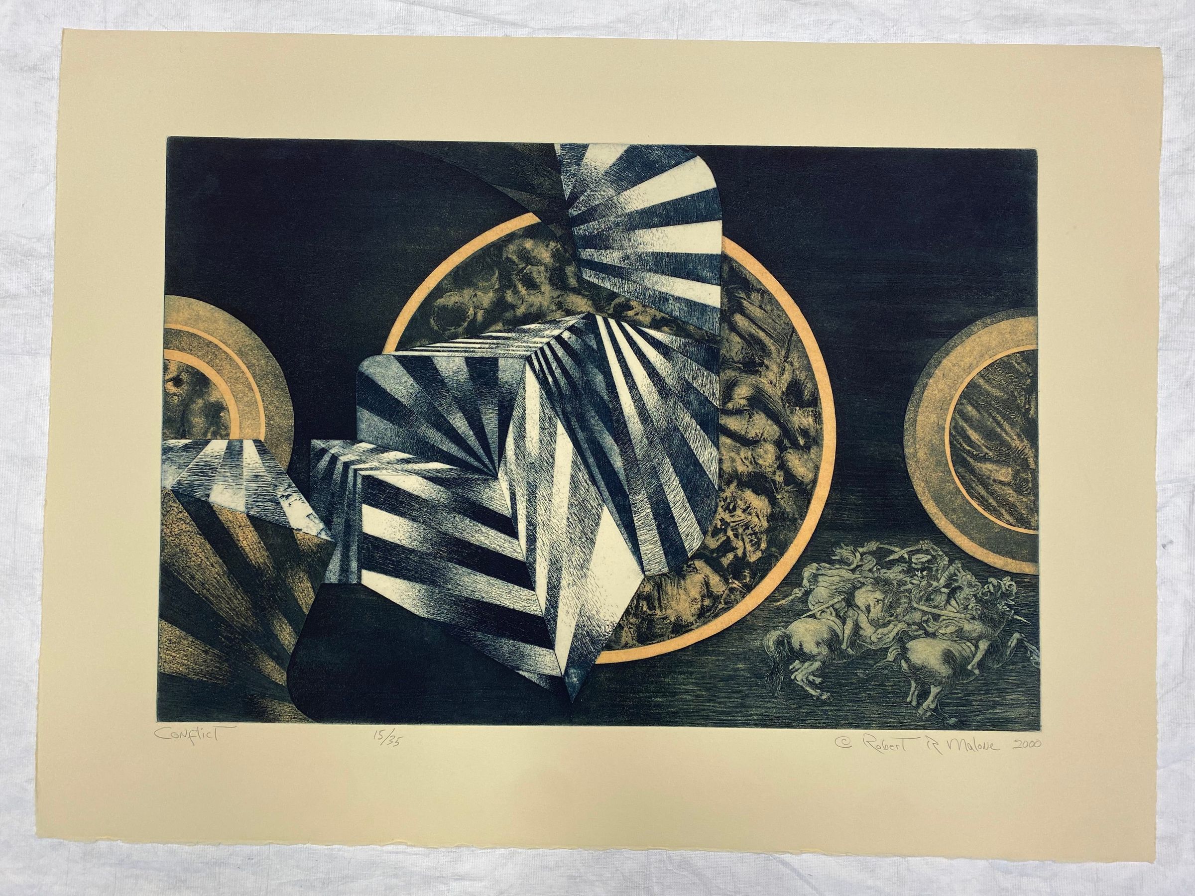 Large horizontal lithographic print with a centrally placed plate of a large-scale patterned geometric shape against a dark background coming into the composition from the top center and bottom right corner. The geometric shapes pattern flow appears to conflict in the center of the composition. There is a large central circle and smaller half circles on both the left and right. In the bottom left corner is a battle scene of two opposing figures with swords on horses in conflict.
