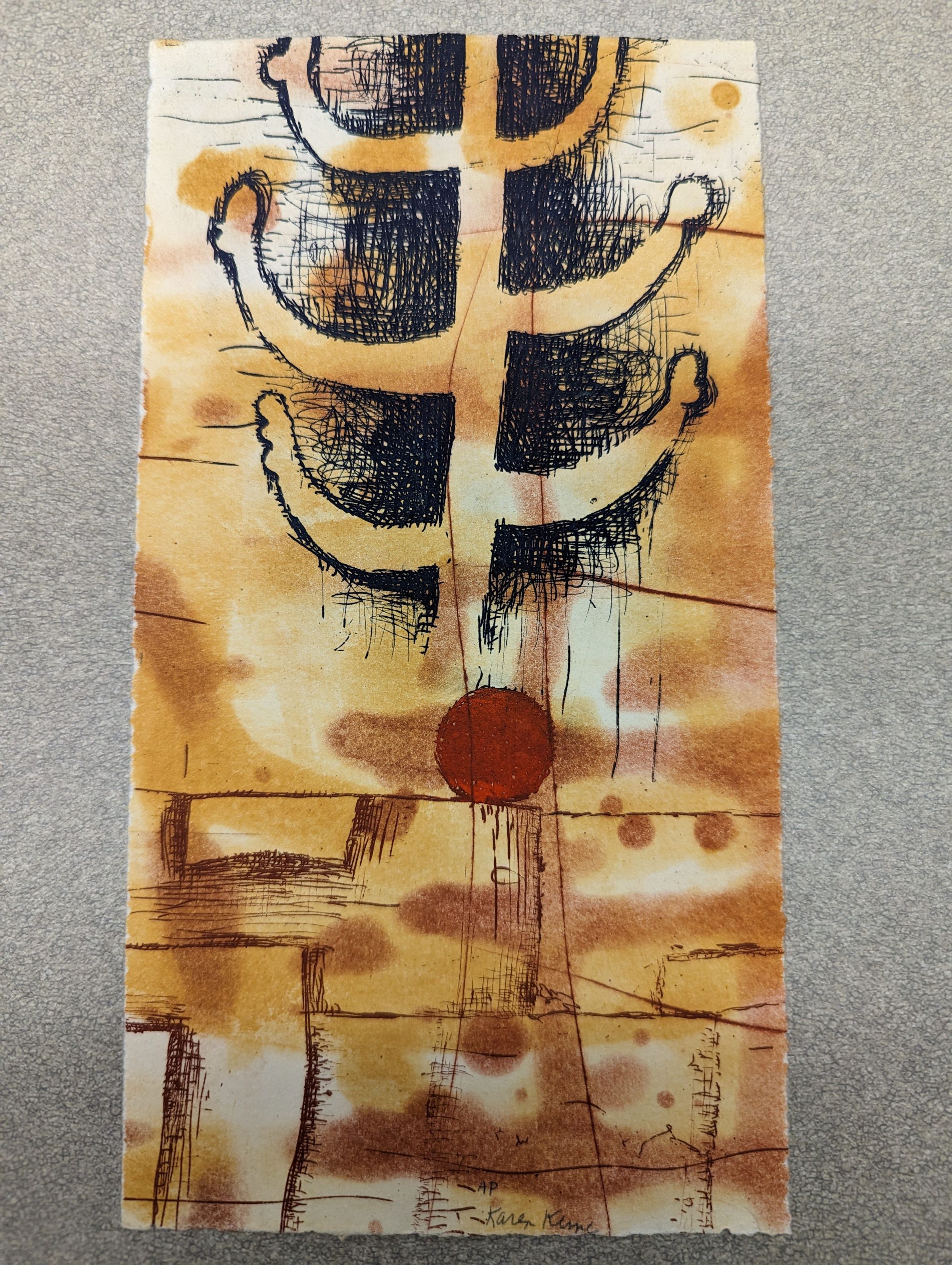 A small vertical print; the background is in stained shades of white, yellow, and brown. The bottom depicts a set of blocky contours with a red ball at their top, above which runs a tree-like abstracted shape with a sketchy black outline behind it. On the back is written "Congratulations Nancy + Ron" alongside the artist's signature.Context