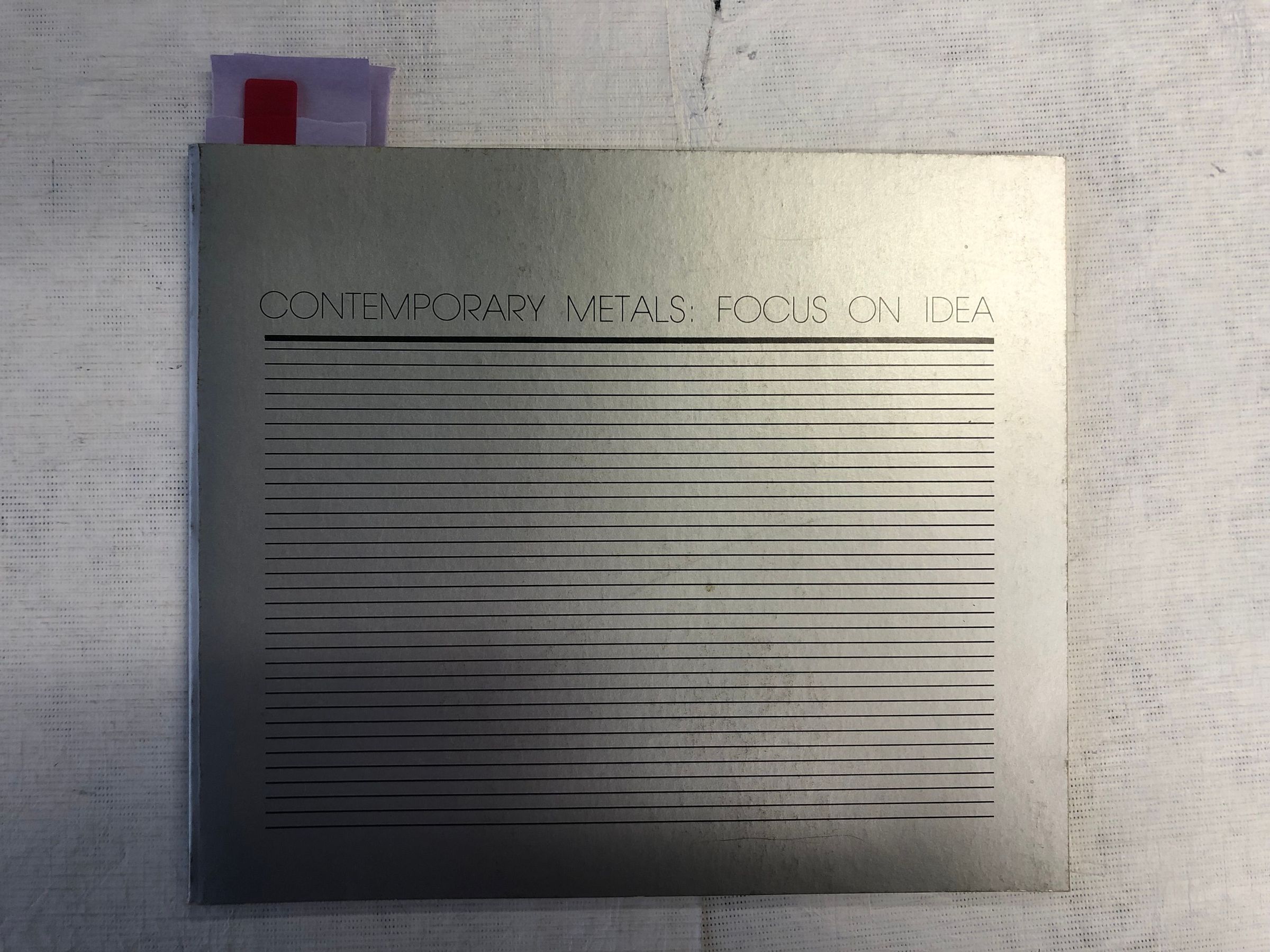 A medium sized, thin silver book with the title central at the top, underlined across the page in a striped pattern. The interior contains an exhibition catalogue introducing the exhibition with conceptual analyses, the images in color, several noted by stickynote.Collection