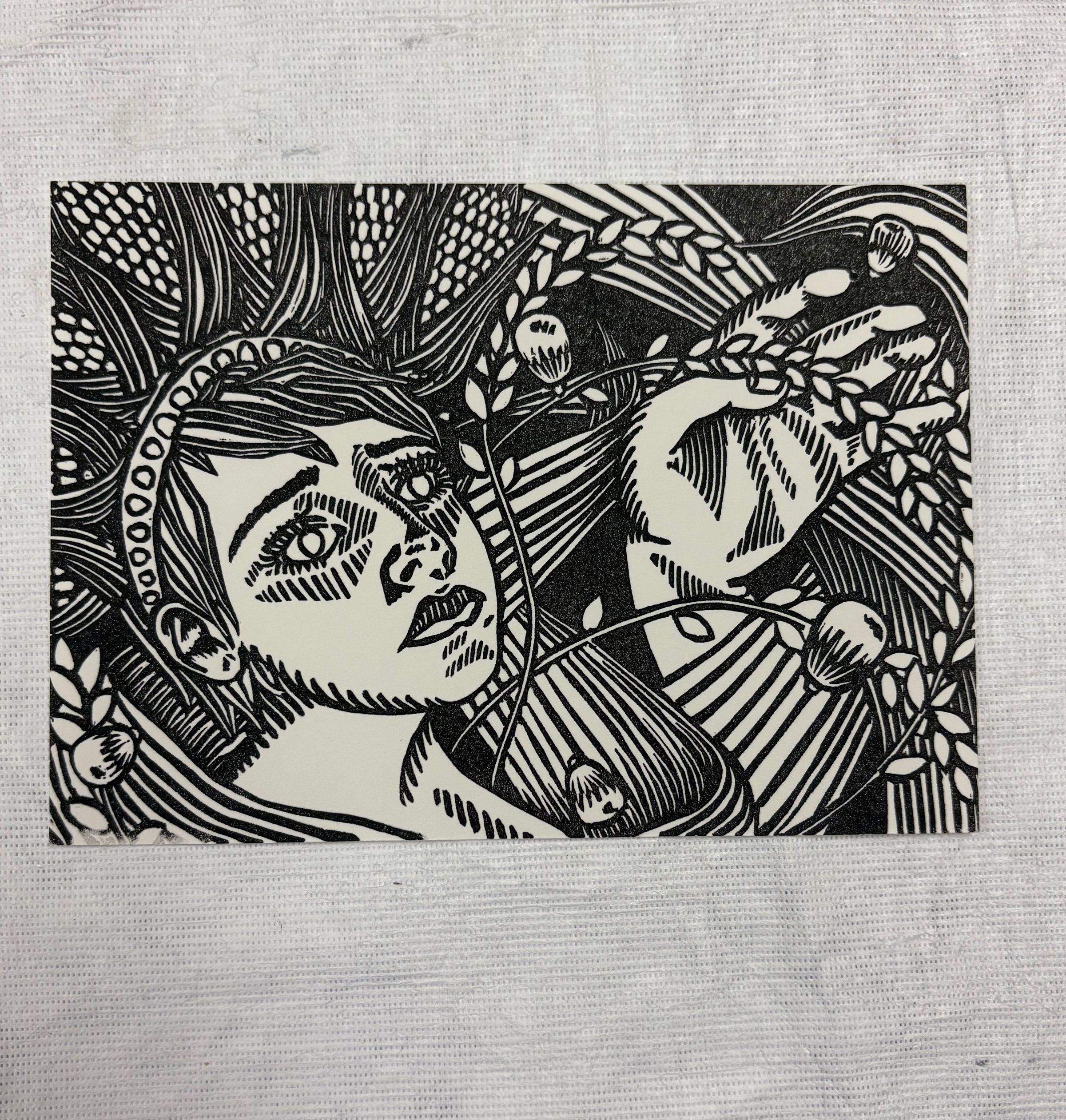 A small, horizontally oriented print that is done on a white ground with black pigment. The entirety of the print is dominated by the figural form of a female figure that has a crown made of corn as she reaches for small kernels and other flora.Collection
