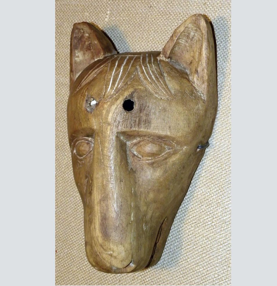 A life-sized triangular mask depicting a peanut-brown animal. There are two triangular ears on top of the head. The carved eyes are under the eyebrows and the cutout eyeholes are for the wearer. There is a long, straight muzzle with carved nostrils and a smiling mouth showing teeth. Incised lines decorate the top of the head. A wire is attached to the back. Excellent condition.Context