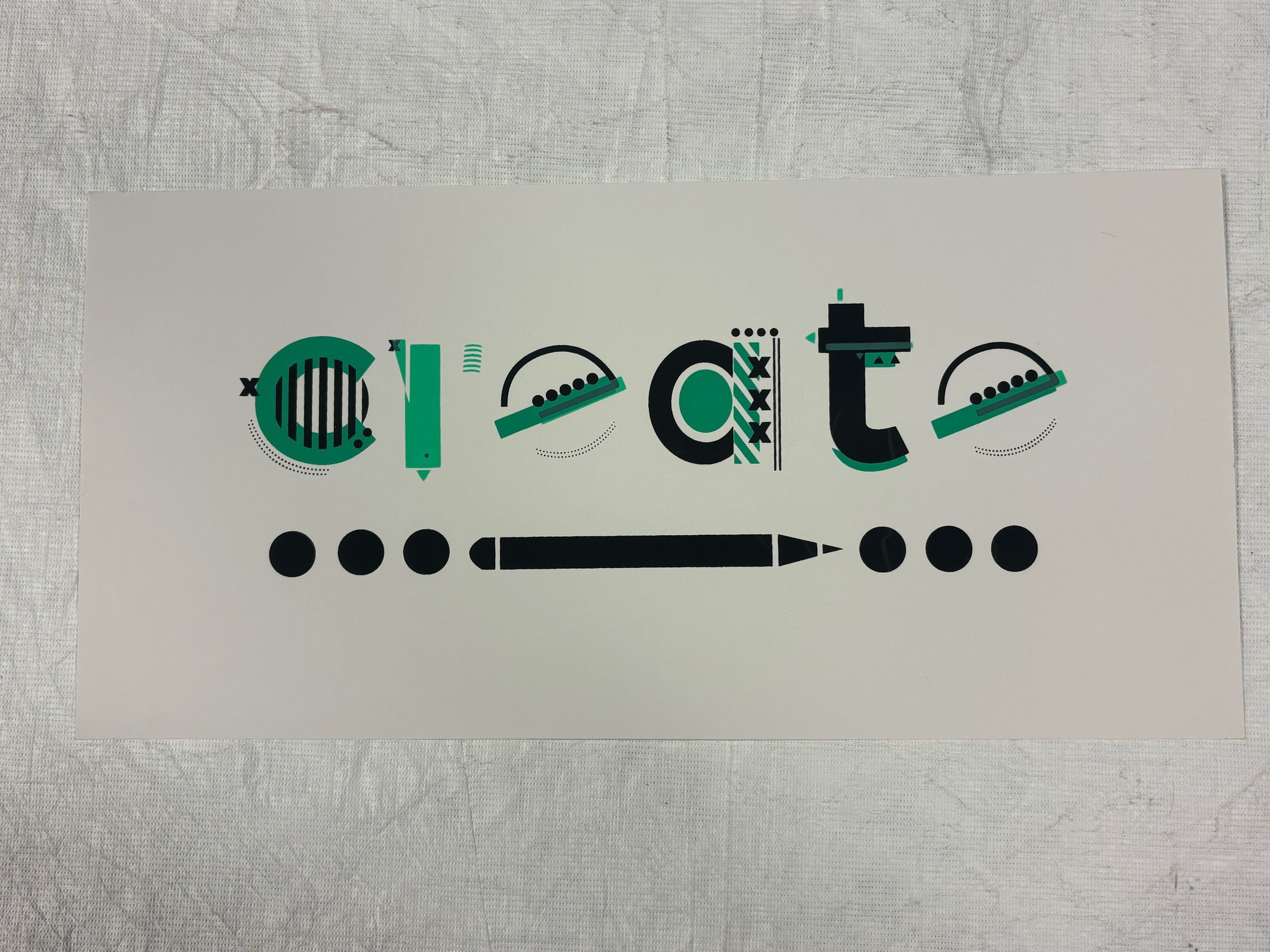 Small, rectangular, horizontally-oriented print of the word "create" with a san seriff font designed with dots, Xs, and lines in green and black. Below the word is a pencil shape with 3 circles on each end.Collection