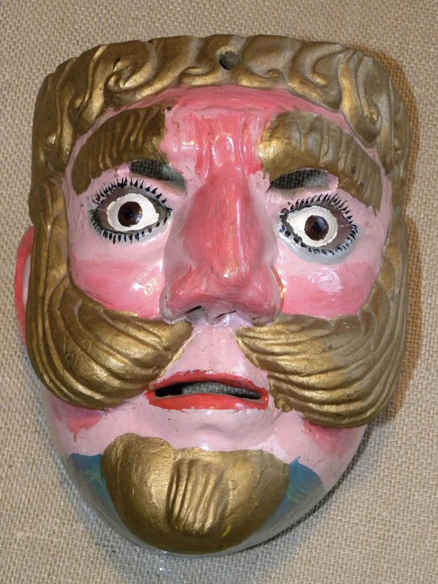 A large triangular wood mask depicting a man with a pink complexion and darker pink blush accents on the cheeks, forehead, ears, and nose. With stylized gold hair that leads into a parted mustache. Large gold eyebrows above cutout eyeholes for the wearer and carved brown eyes outlined with painted lashes. A large, curved nose is above a slightly open red mouth. The gold goatee is on a painted blue chin. A wire is attached to the back of the mask.Context