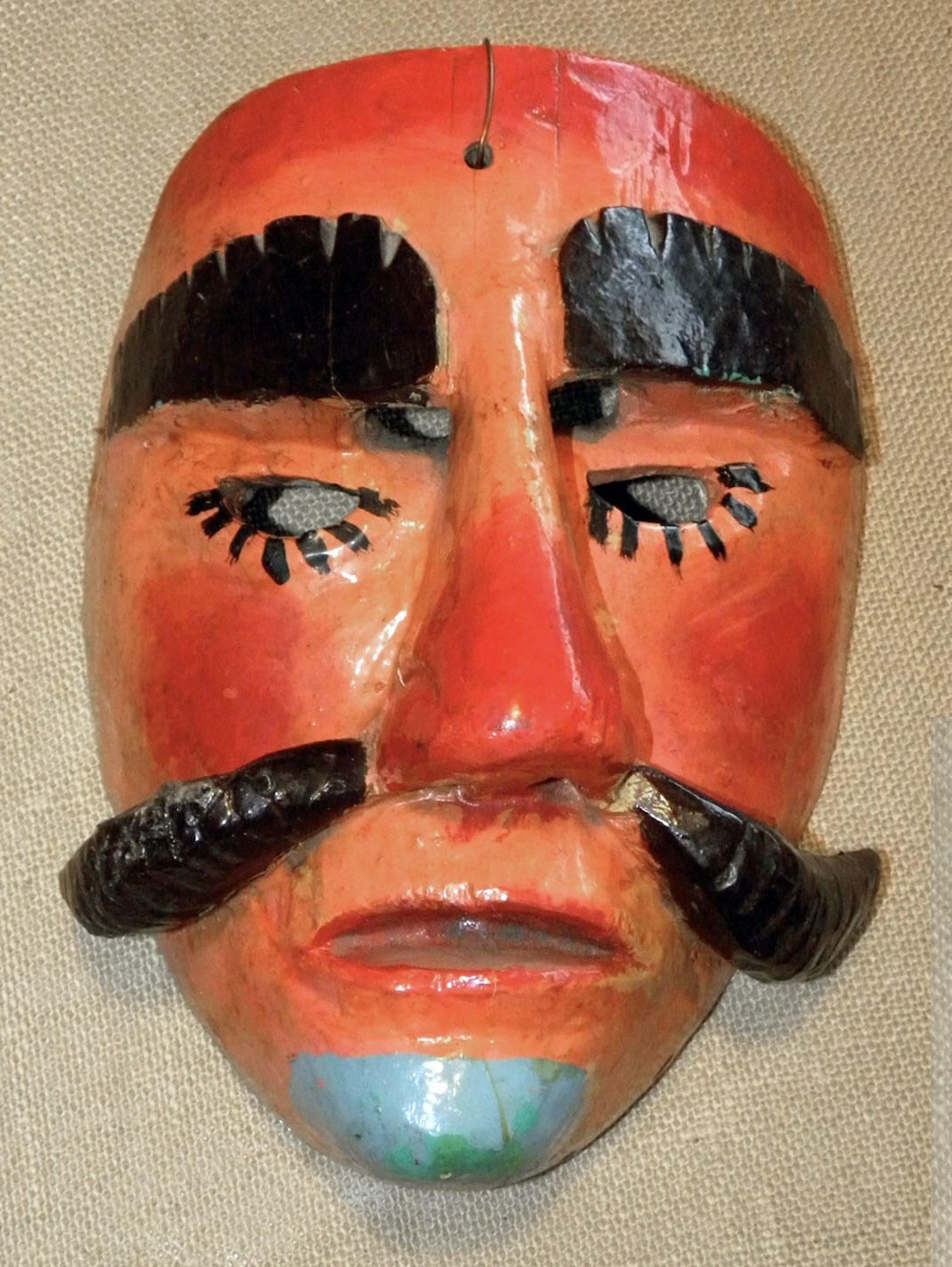 A large oval wood mask depicting an apricot orange complexion with blush accents on the forehead, cheeks, and nose. With heavy black eyebrows are above two sets of cutout eyeholes. A large nose is in between a black parted mustache. A slightly open mouth is above a sky-blue painted chin. A wire is attached to the back of the mask.Context