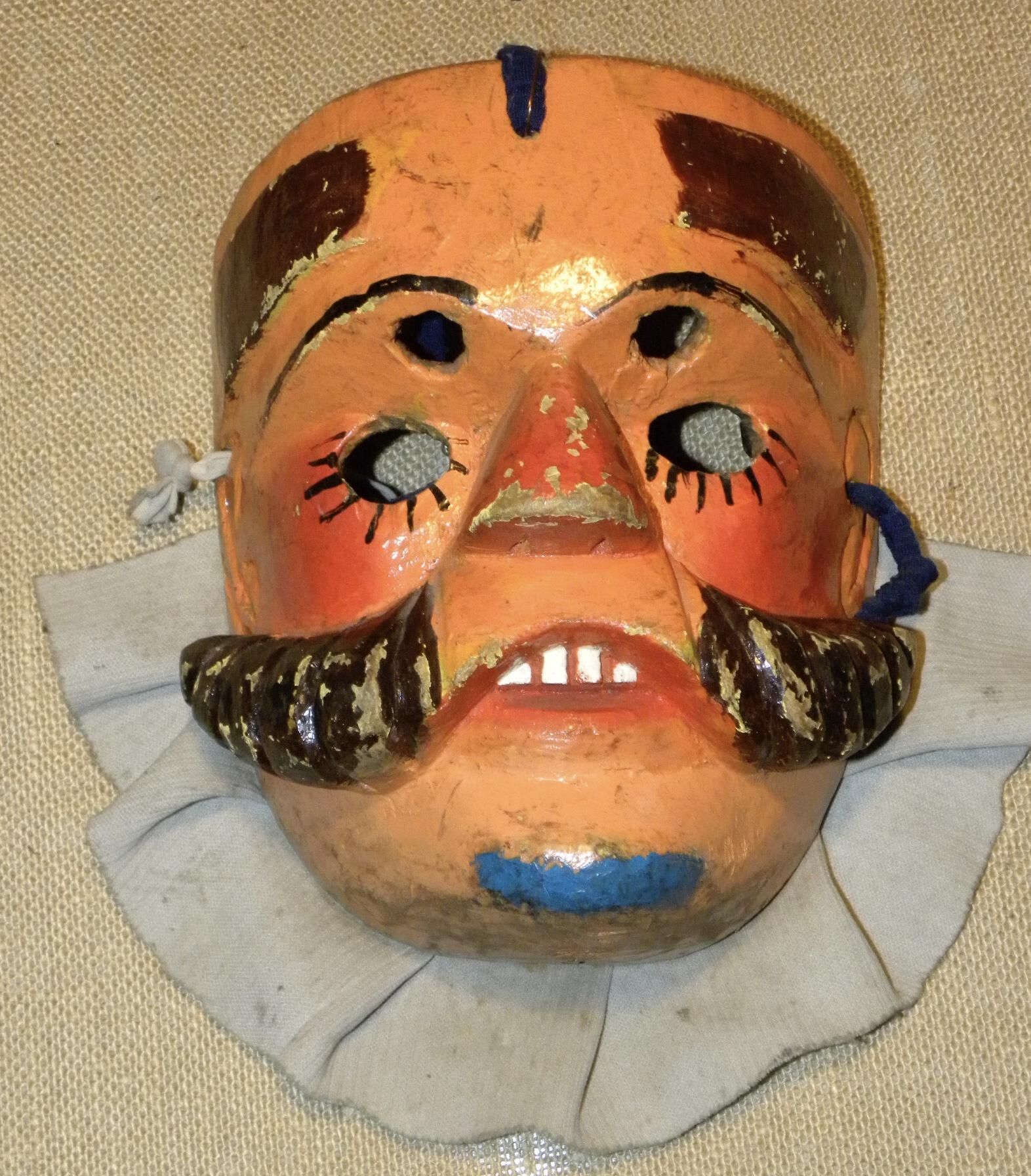 A life-sized rectangular wood mask depicting a man with an apricot orange complexion and peach blush. Large brown eyebrows are above two sets of cutout eyeholes. A short triangular nose is above a parted brown mustache and a downturned mouth with white teeth. A small patch of blue is on the chin. There is a half-circle white ruff around the lower edge of the mask. A wire and blue and white fabric are attached to the back of the mask. Some signs of pigment loss.Context