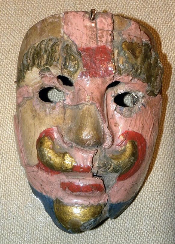 A life-sized rectangular wood mask depicting a man with a peach complexion. With large gold eyebrows over two sets of cutout eyeholes. A small nose is over a curled parted gold mustache. Red details between the brows and around the mustache and mouth. A gold goatee is on the blue chin. A wire is attached to the back of the mask. The mask is heavily used with much paint loss and cracking.Context