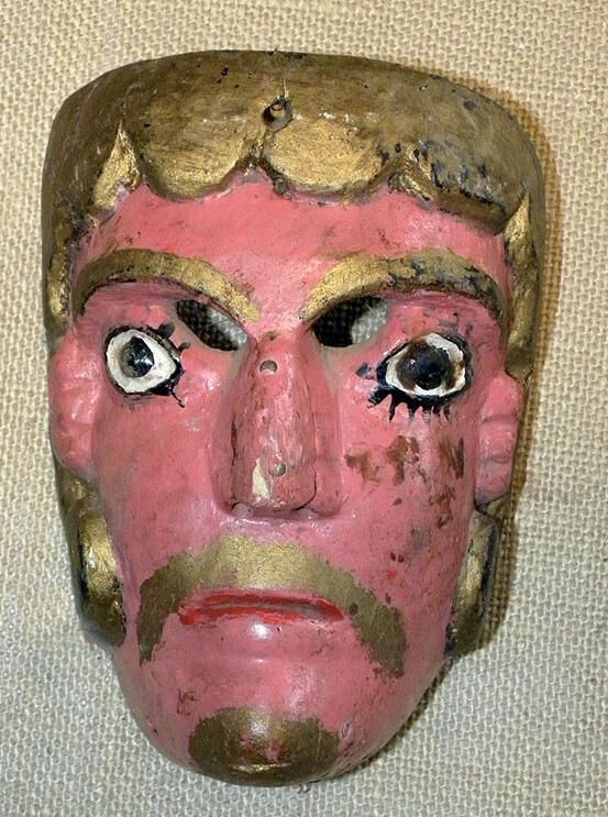 A life-sized triangular wood mask depicting a man with a rouge-pink complexion. The wavy gold hair goes into curled gold sideburns. Wideset painted eyes outlined with black eyelashes. Two cutout eyeholes for the wearer are in between the eyes and under gold eyebrows. A large, hooked nose is above a painted gold mustache and a closed, red mouth. A gold goatee detail on the chin. A wire is attached to the back of the mask. Overall signs of cracking and paint loss.Context