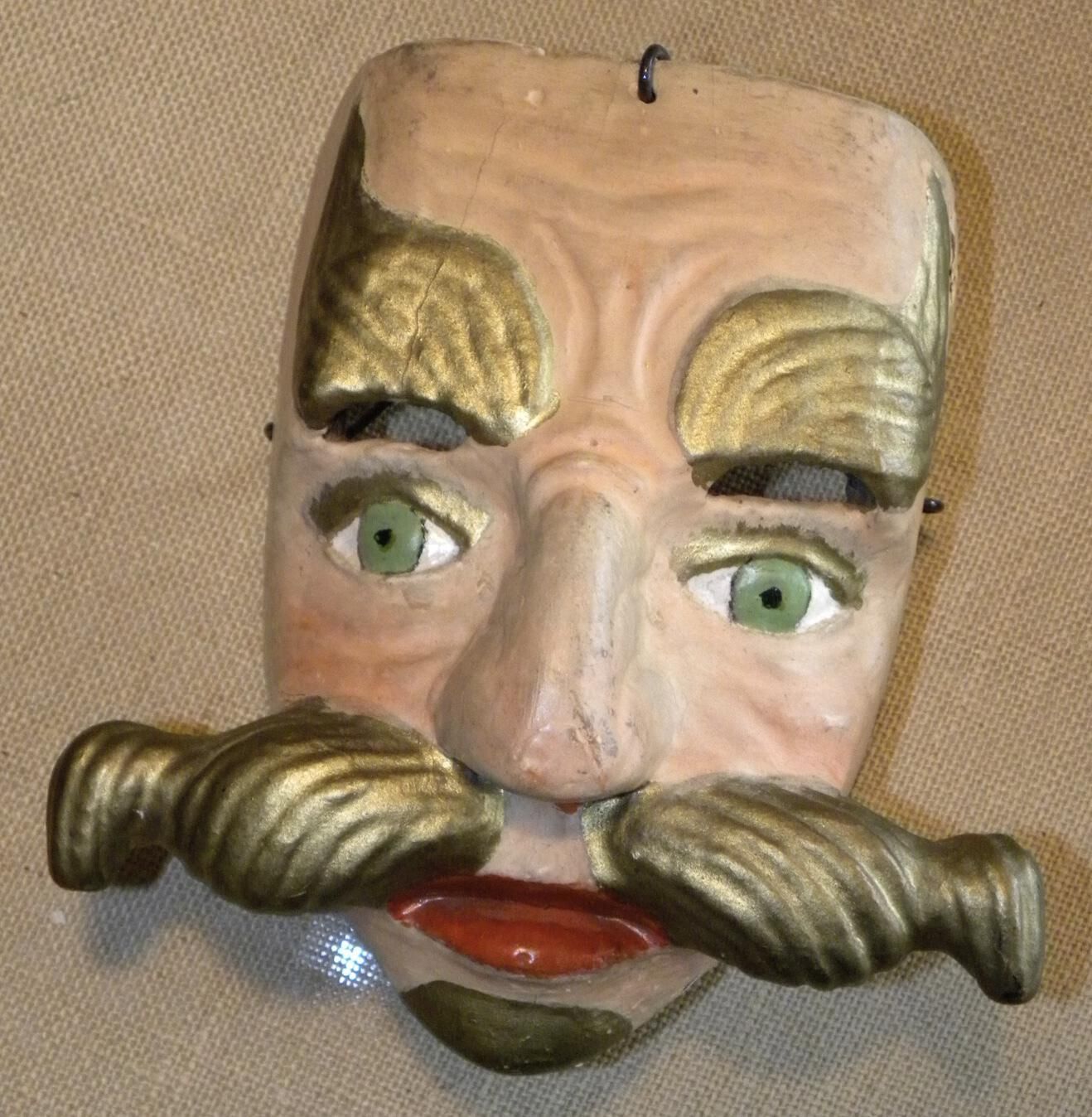 Painted, wood face-mask depicting a male with oversized gold eyebrows, mustache, and chin; painted green with additional eye-holes above; large hooked nose above a red mouthContext