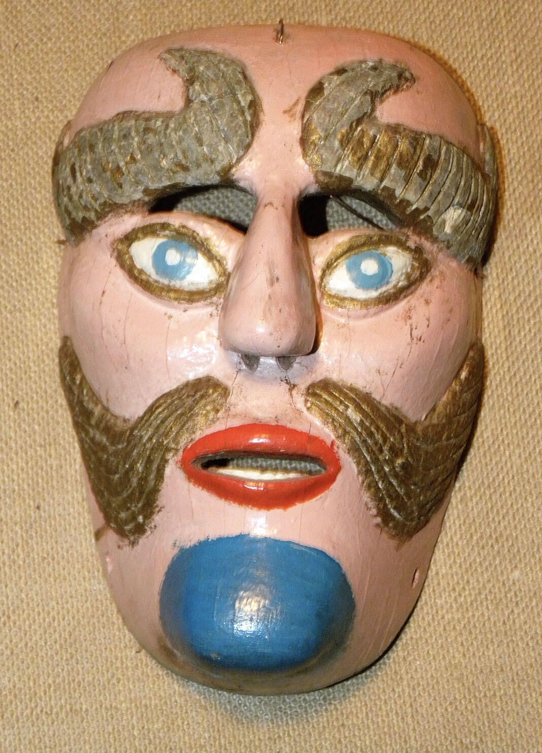 A life-sized rectangular wood mask depicting a man with a pale ivory complexion. Large, curled gold eyebrows are over cutout eyeholes for the wearer and painted blue eyes outlined with gold. A small nose is above a parted gold mustache and a slightly open red mouth with white teeth. The chin is painted blue. A wire is attached to the back of the mask.Context