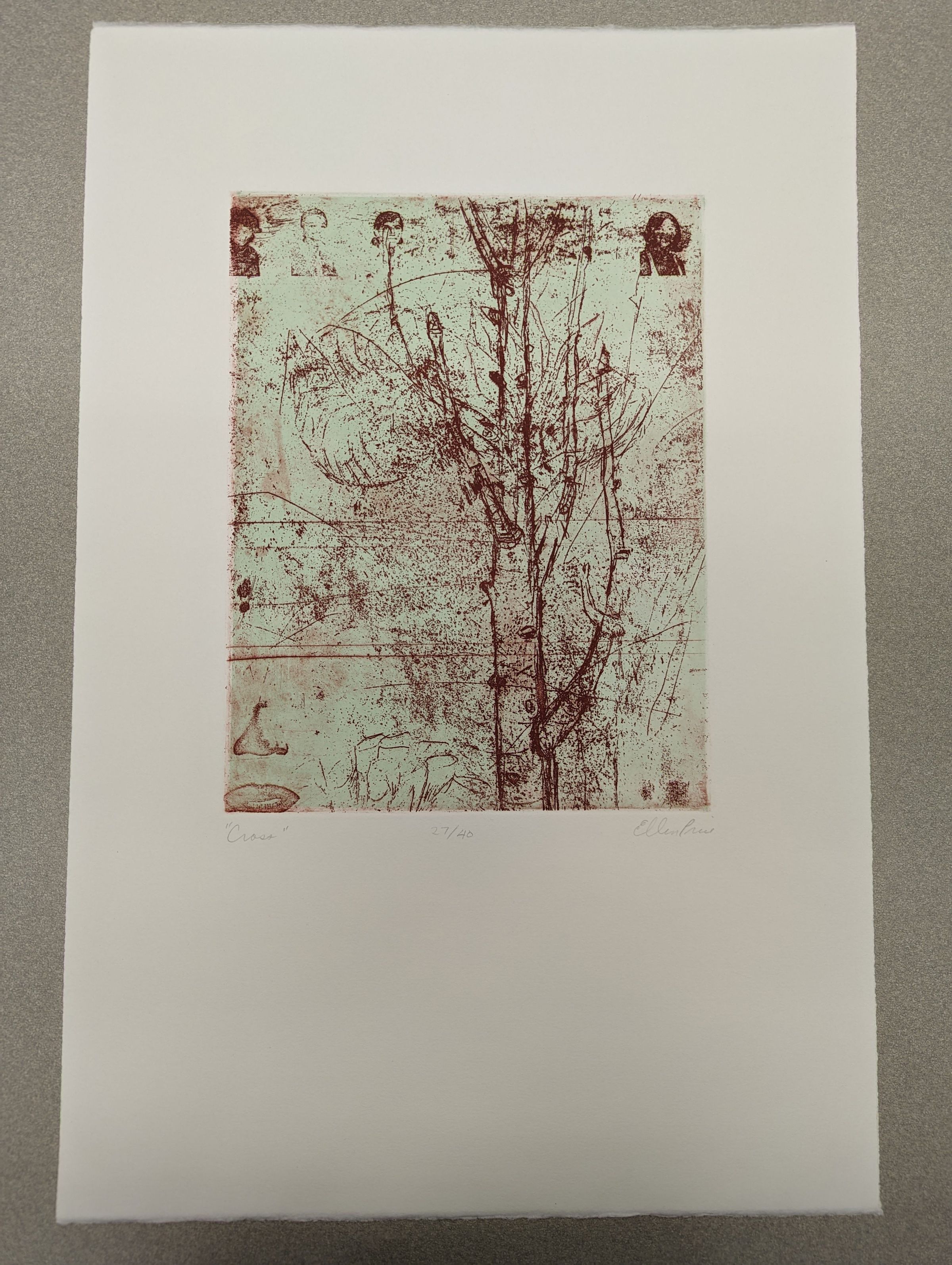 A rectangular print of red lines and designs and images on a pale green background; the imagery includes a tall tree, a rose, a nose and mouth, and children's photos as out of a yearbook.Context
