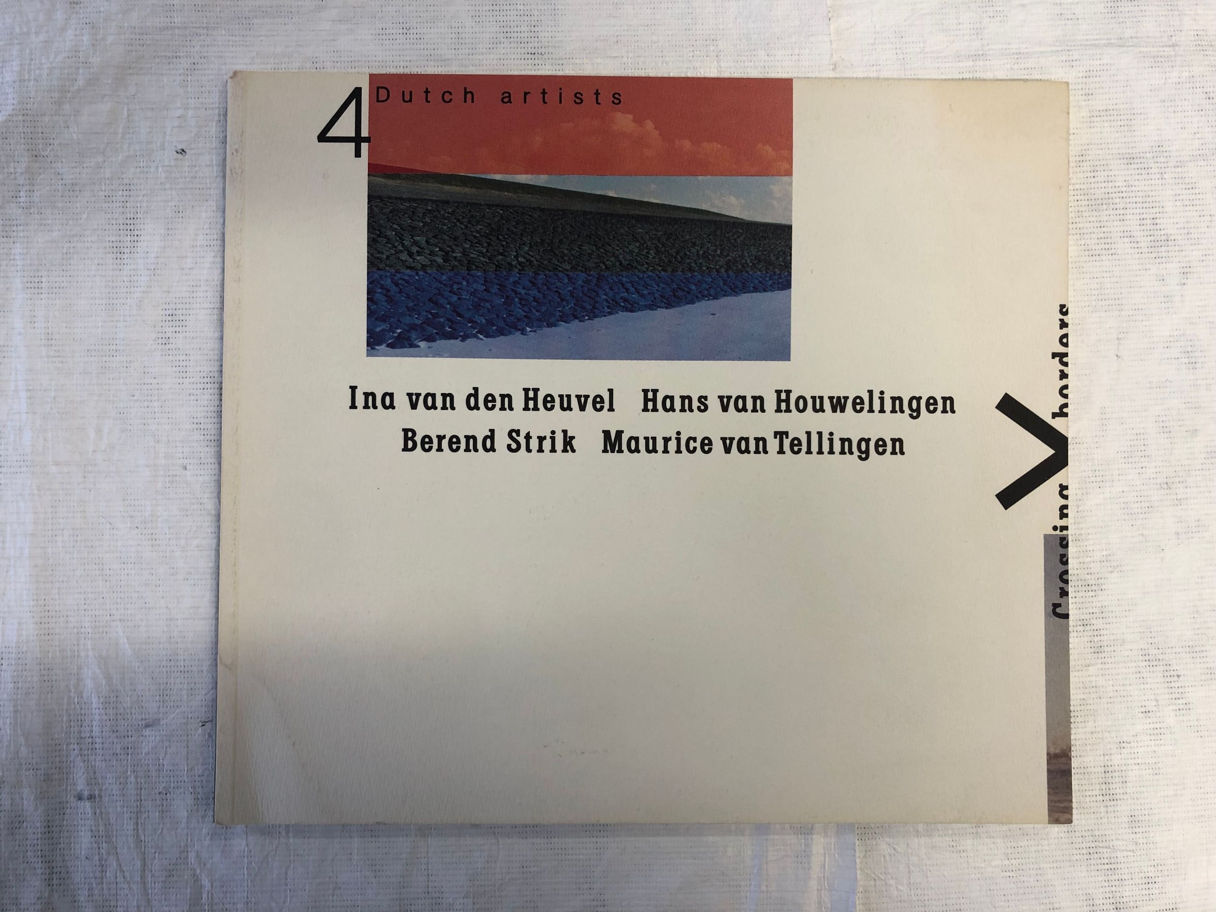 A medium sized, thin white book with a photo in blue and red at the central left with the artists below in black, central. The interior contains an exhibition catalogue that introduces the artists and details the pieces, the images in black and white.Collection