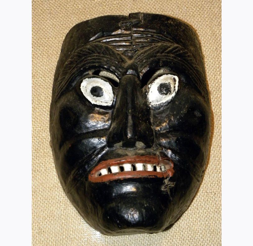 A life-sized rectangular, black-painted wood mask with a grimacing face. The forehead has incised lines and incised eyebrows. Carved and painted black eyes surrounded with white. Cutout eyeholes for the wearer are above the eyes. A large, crooked nose is above a red mouth bearing white teeth. A wire is attachedContext