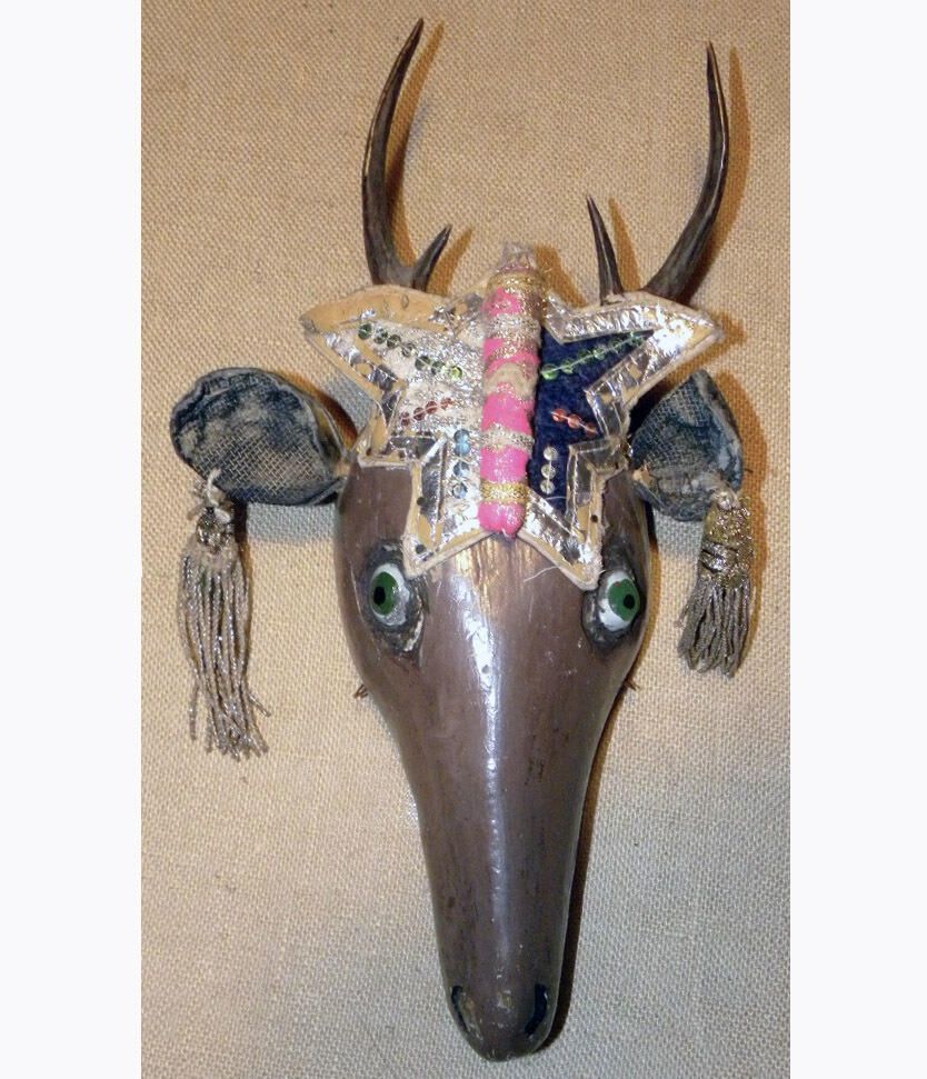 A large teardrop-shaped wood mask depicting a mocha-brown deer. Small deer antlers are attached to the top of the head. A large polychrome fabric applique is attached to the forehead. Fabric ears with tassels are attached to the sides of the head. Inset green glass eyes are surrounded by white. A long muzzle has a carved mouth and two nostrils. A wire is attached to the back of the mask. Some chipping on the nose and a large crack in the back of a mask.Context