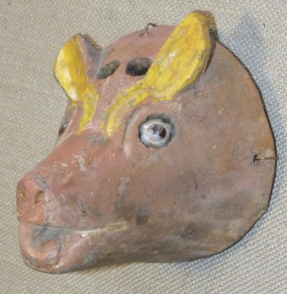 A medium-sized circular mask depicting a blush-red pig. There are inset plastic brown eyes and two circular cutout eyeholes for the wearer. There is a long snout with an open mouth and an extended tongue at the end. Small upright canary-yellow ears protrude from the head. A wire is attached to the back of the mask. Overall signs of paint loss.Context