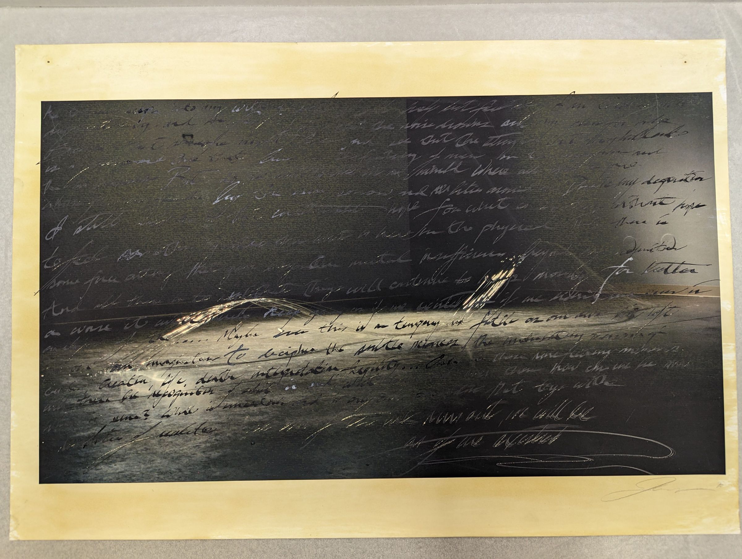 A print on yellowed paper of a photographed image of a strip of wavy glass on a lit black stage, over which is written a paragraph of black calligraphy.Collection