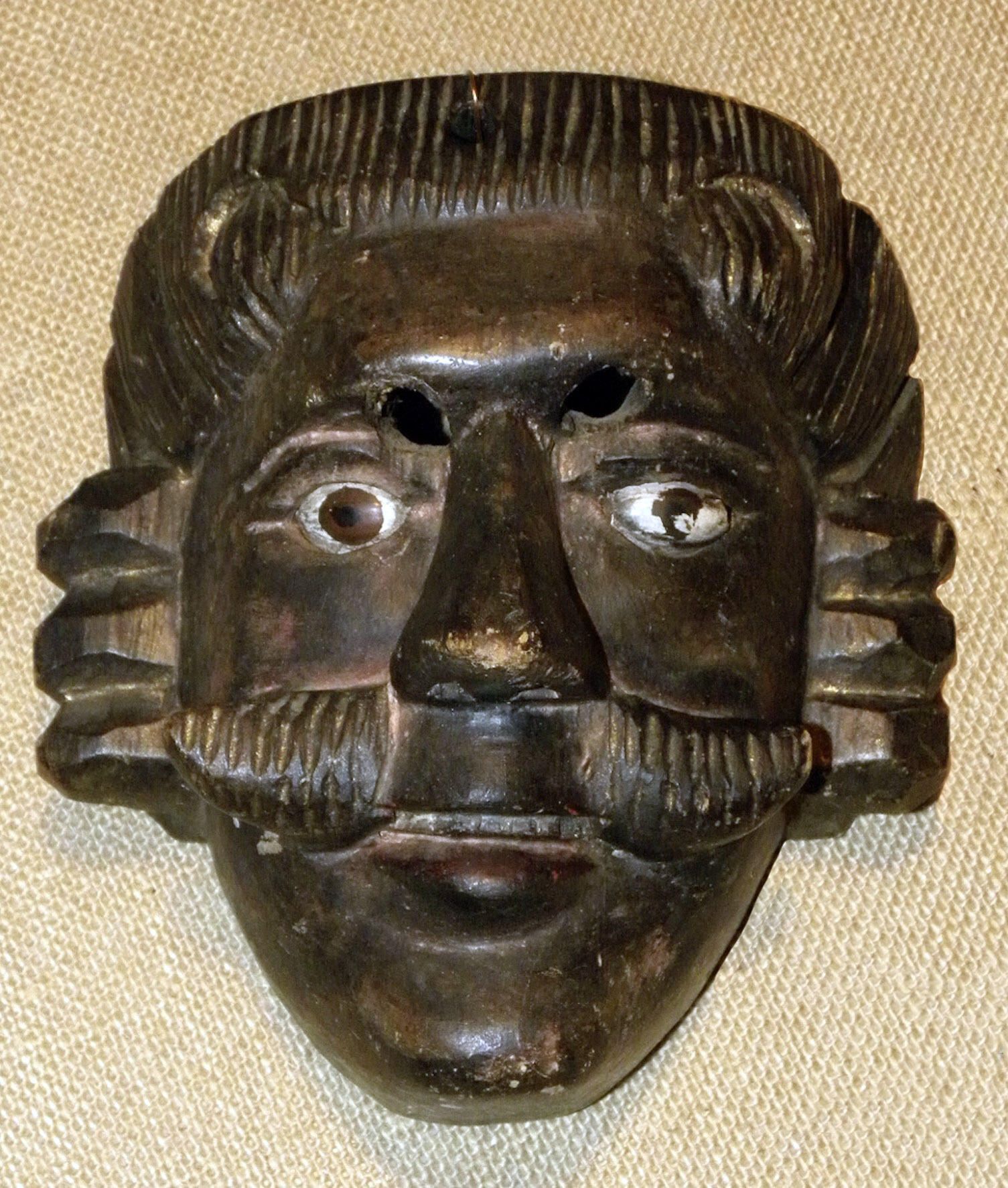 A life-sized triangular wood mask depicting a man with dark umber skin. The mask has black carved hair that leads into sideburns. Two cutout eyeholes for the wearer are above two inset brown eyes. A straight nose is above a parted mustache and a closed mouth. A wire is attached to the back of the mask. Overall signs of pigment loss.Context