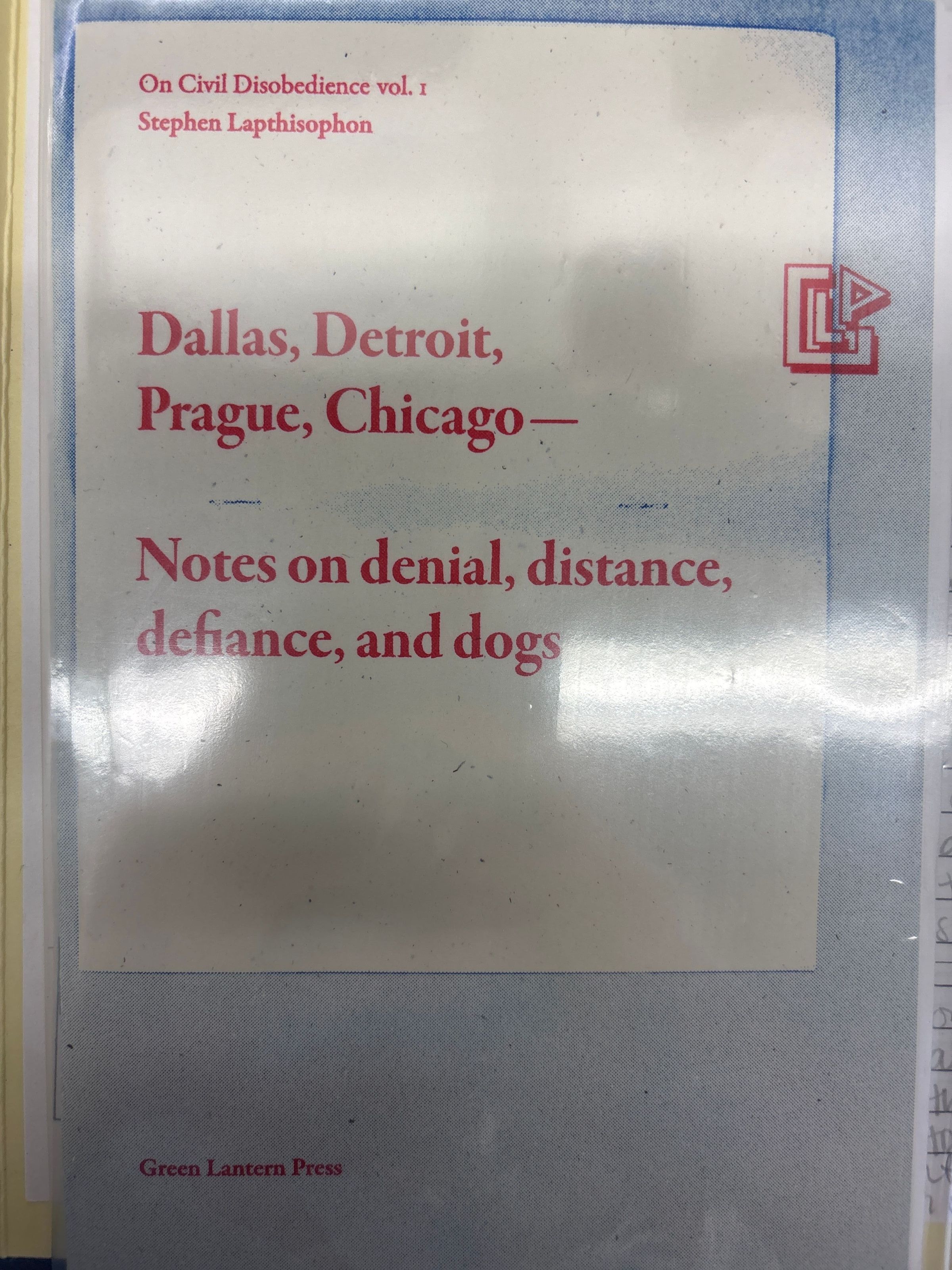 The front cover has a white box surrounded by blue ink with red text inside for the title, author, series, and publisher. The interior text in black on white paper. The back cover is white paper with small black dots and is in blue and red ink for the text.Collection