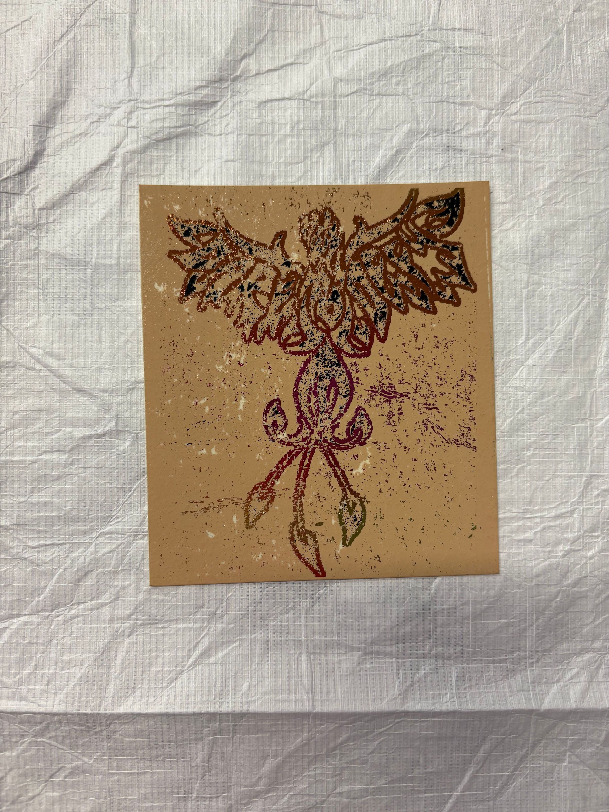 A small, vertically oriented print that uses multiple colors such as green, red, orange, black and magenta, these colors also have a shimmery like sheen to them. Almost the entirety of the print is taken up by a phoenix like figure that is the central figure of the work.Collection