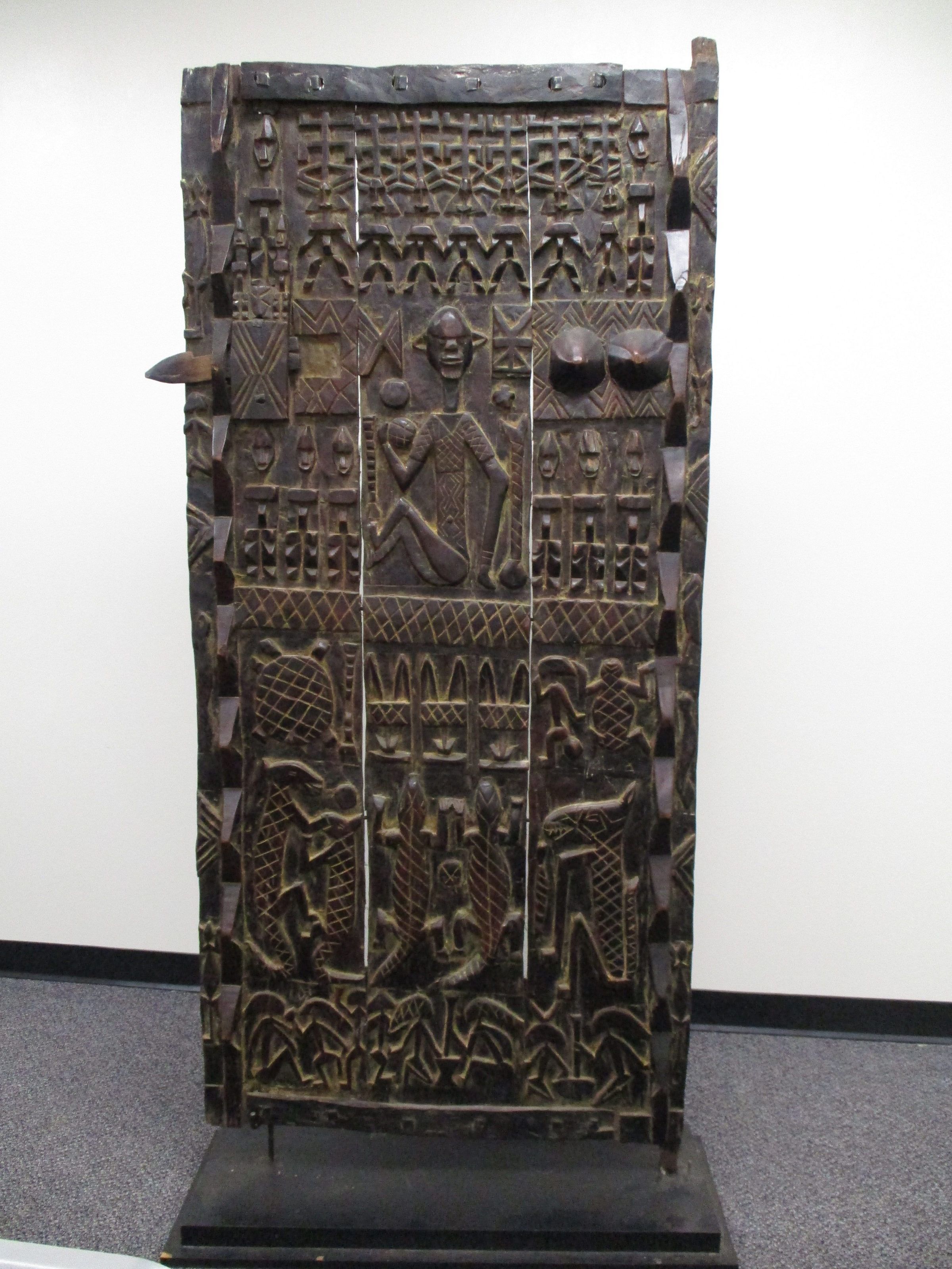 A tall, rectangular dark wooden door carved with rows of ornamentation: people in rows, masks, geometric patterns, etc. Centered is the shape of one person sitting and holding a sphere; below them, the designs evoke different animals, arrayed on each side. A metal armature is screwed into the back of the door.Collection