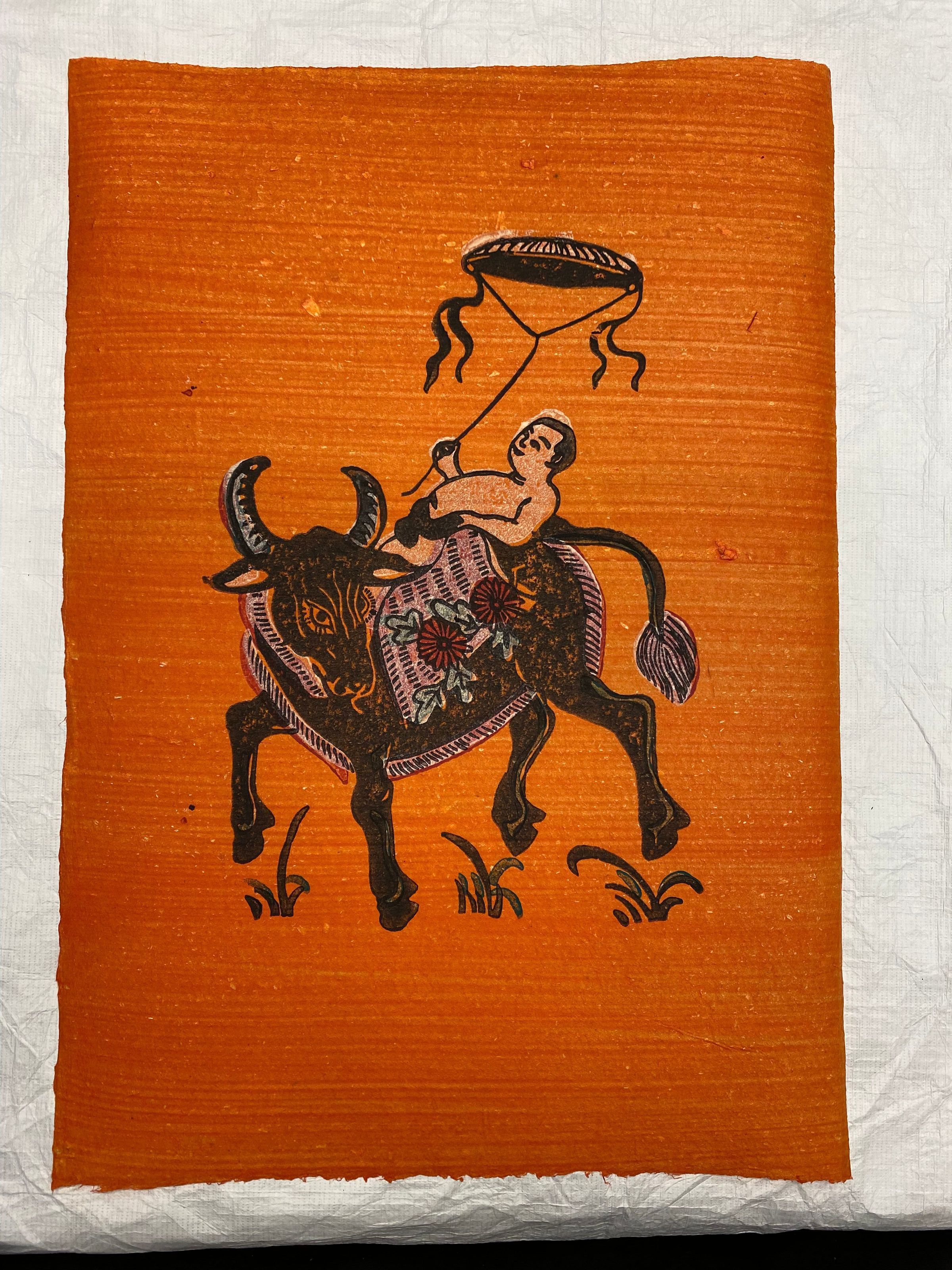 Traditional Vietnamese folk woodblock print on plant fibrous paper vertically depicts a male figure reclined holding a kite while riding on a buffalo.Context