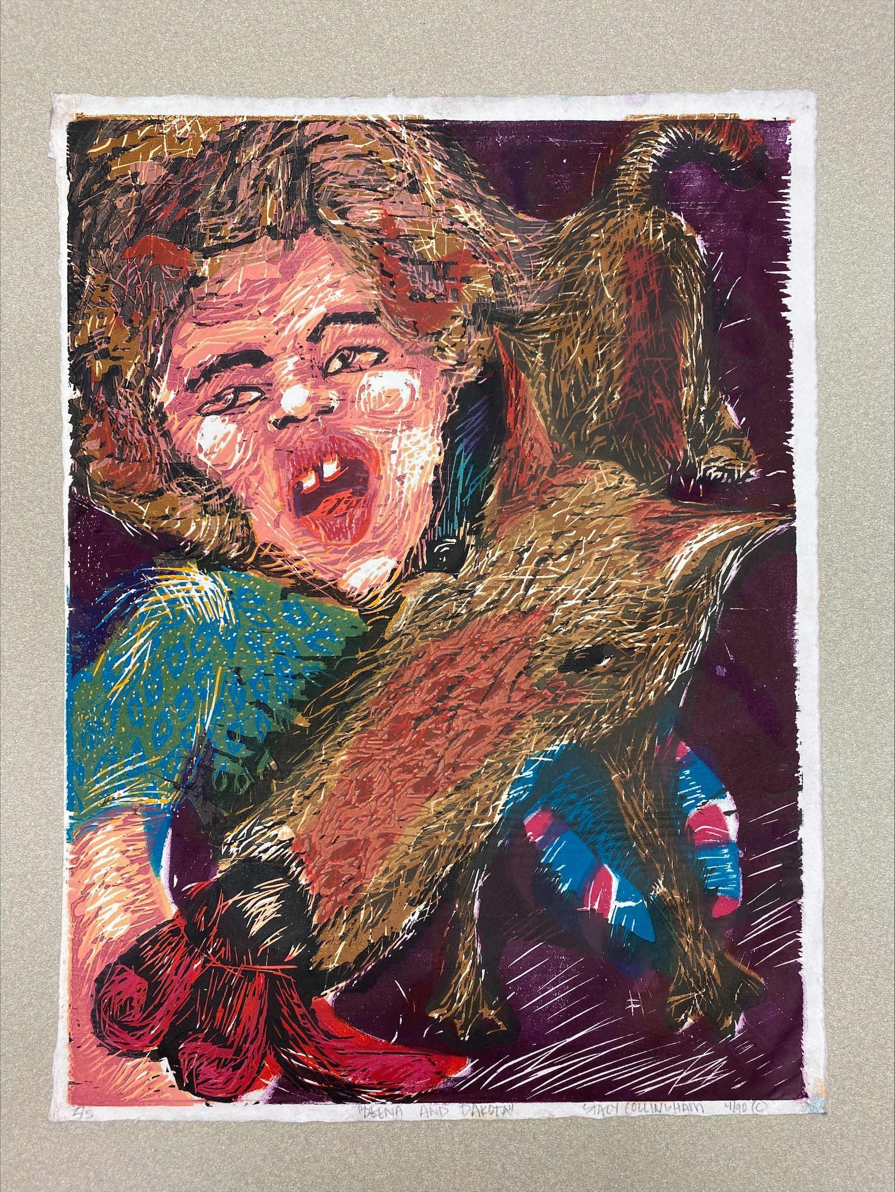 This is a large print on mulberry paper of a figure and a dog, the figure appears to be yelling as the dog is on them. Both figures are made of various hues and thick/thin lines.Collection