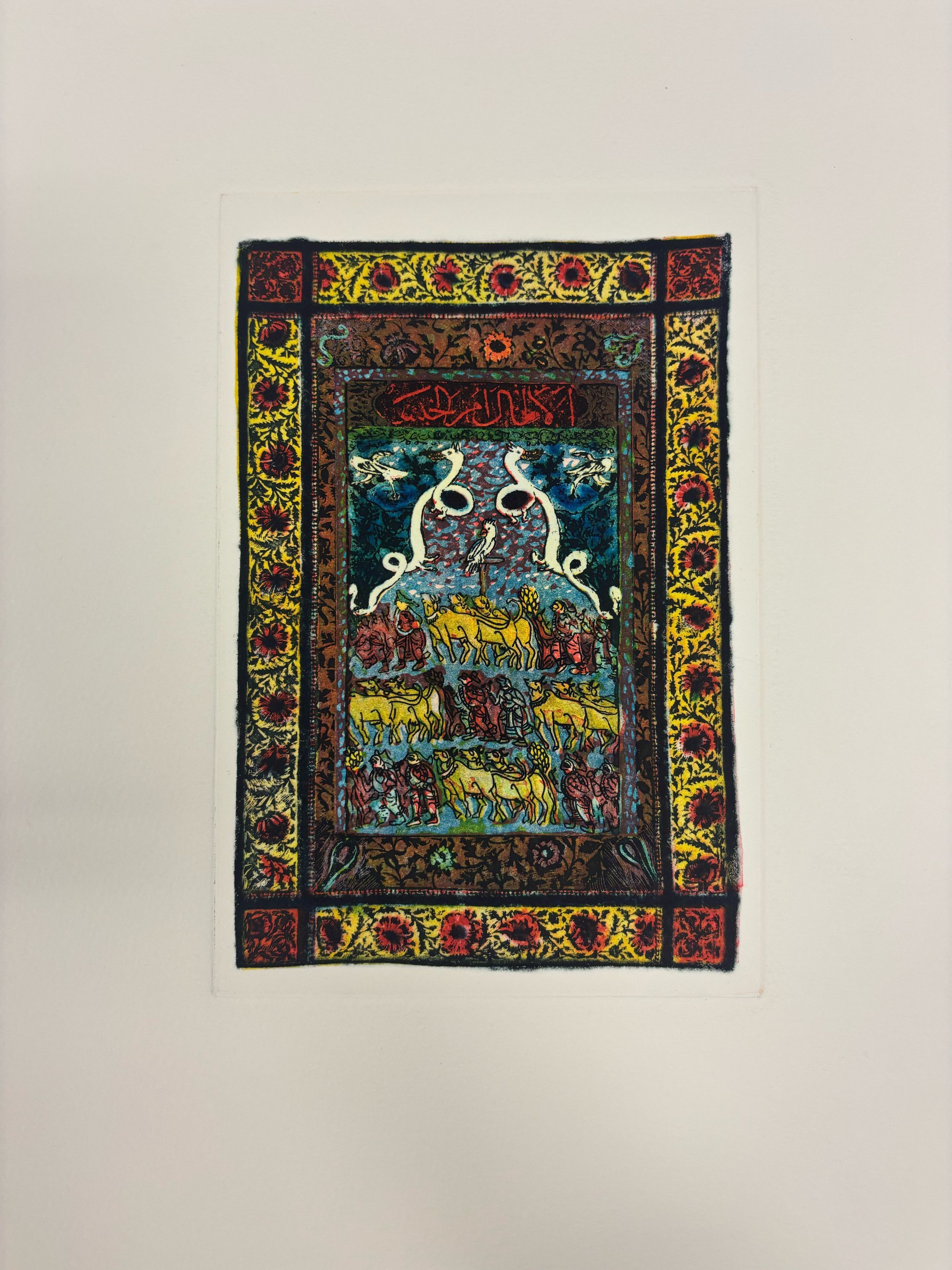 Large rectangular vertically oriented print with an image of a colorful detailed patterned rug in the middle center. The flower motifs surround an image of people and animals marching in three rows with birds above. Foreign characters, could be Sanskrit or Arabic characters, are featured.Context