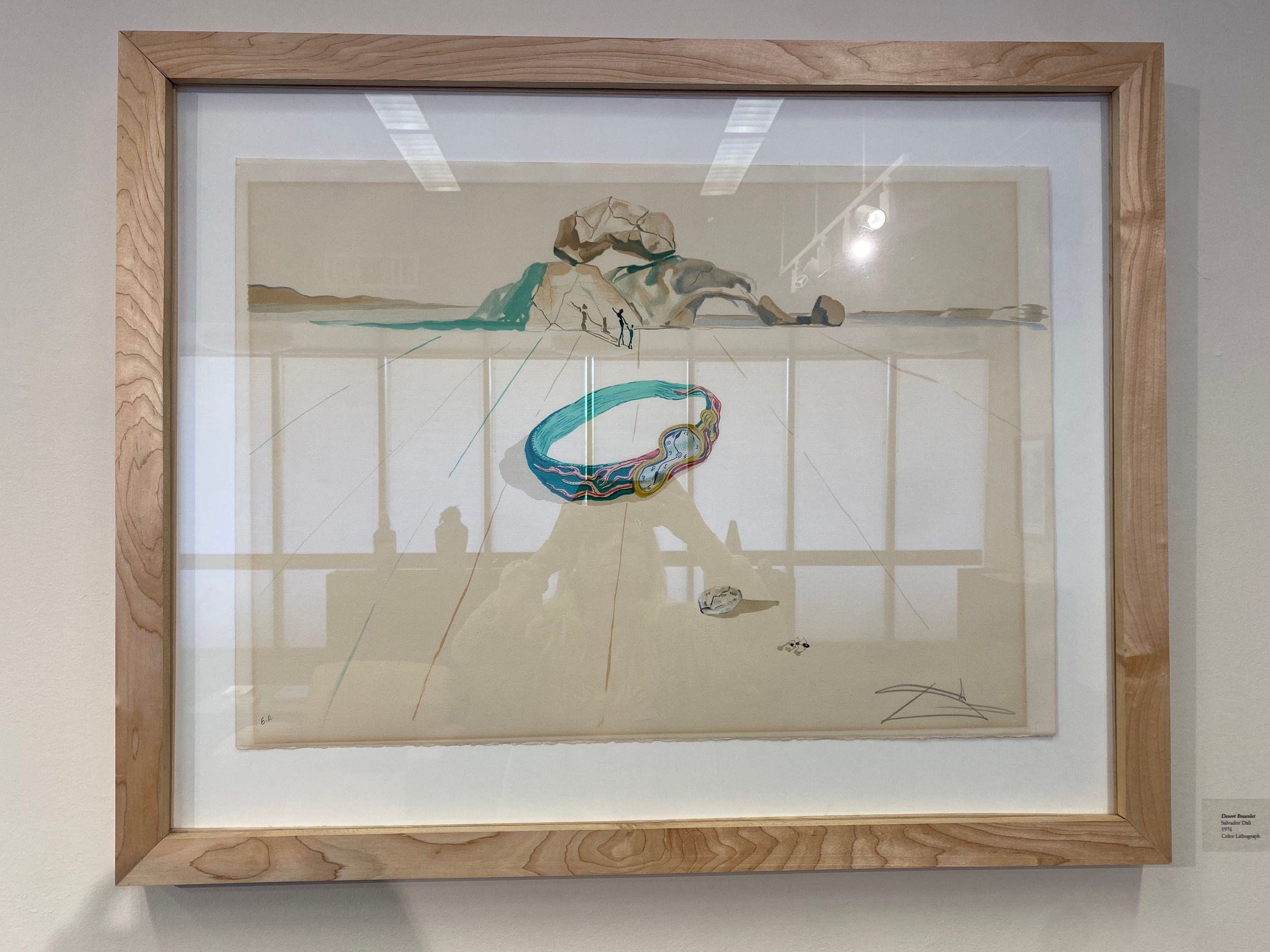 Large print on cotton paper with abstracted forms of ant, watch, and figures in landscape.Context