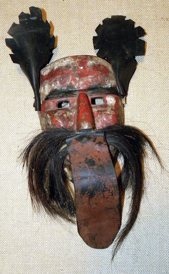 A long triangular wood mask depicting a figure with a crimson complexion. Two black rubber ears are attached to the forehead. A large brow is above the cutout square eyeholes. The straight nose is above a large animal hair mustache and an extra-long rubber tongue. A wire is attached to the back of the mask. The face has signs of extreme paint loss.Context