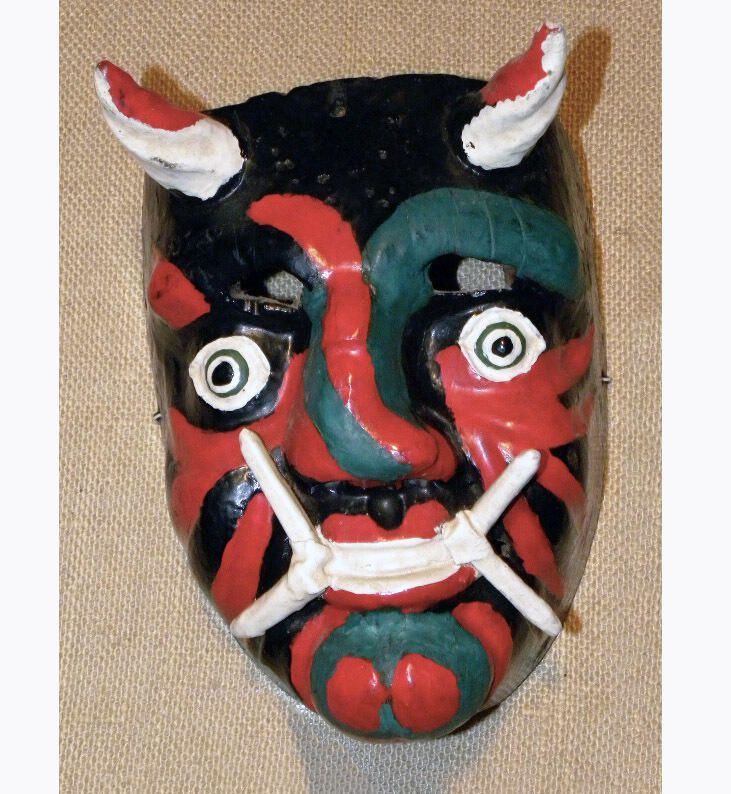 A life-sized rectangular wood mask depicting a figure with a black complexion and red and green designs. Two red and white twisting horns protrude from the head. Two black eyes are encircled with green and set in white circles. The cutout eyeholes for the wearer are above the eyes. A large bumpy nose is decorated with a red and green twisting design. The mouth is created with white teeth and four white tusks. A wire is attached to the back. Overall good condition.Context