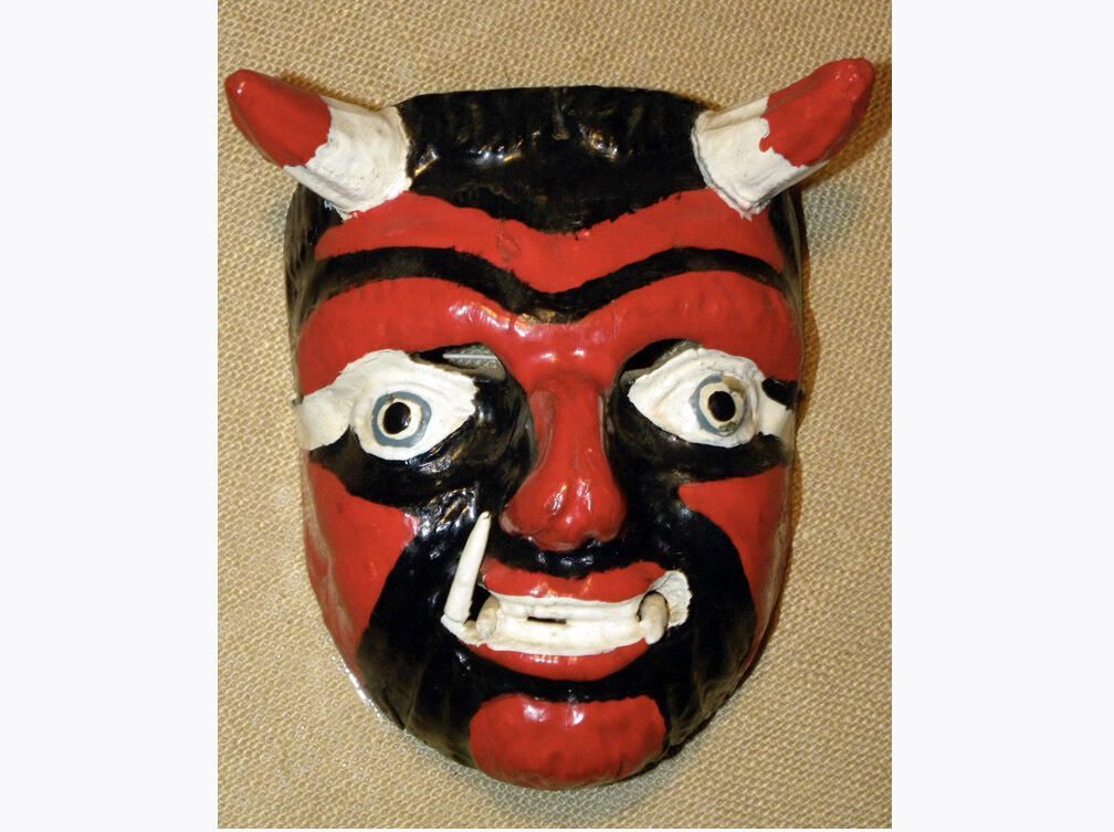 A life-sized rectangular wood mask depicting a figure with a black complexion and red designs. Two white horns with red tips protrude from the head. Two black eyes encircled with green and set in white. The cutout eyeholes for the wearer are above the eyes. A large, hooked nose is above a mouth with white teeth and two white tusks. A wire is attached to the back of the mask. Overall good condition.Context
