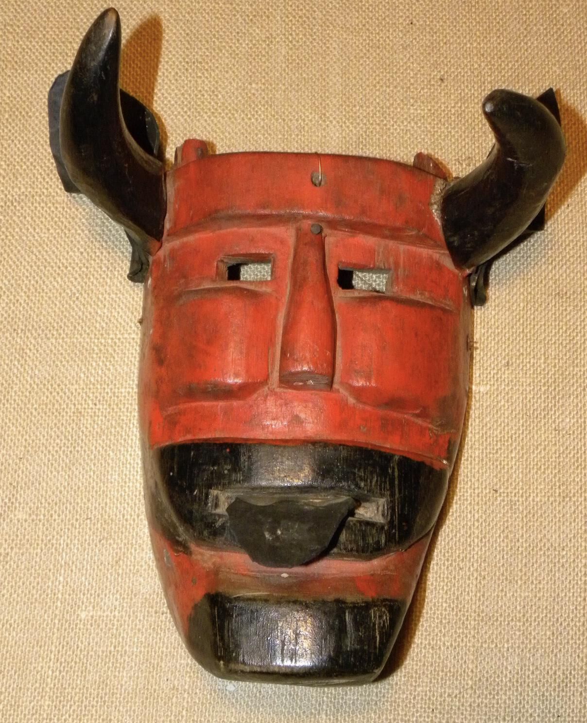 A large rectangular wood mask depicting a figure with an apple-red complexion. Two large black horns and ears are attached to the forehead. A large brow is above two cutout square eyeholes. The straight nose is above a large black mouth with a protruding black tongue. A large black chin extends from the face. A wire is attached to the back of the mask. Some signs of paint loss.Context