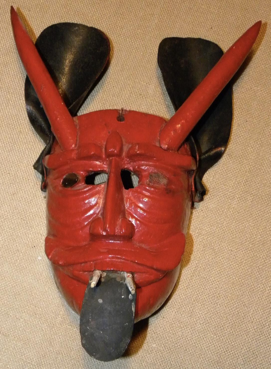 A long rectangular wood mask depicting a figure with a scarlet-red complexion. Two large scarlet-red horns and black ears are attached to the forehead. Two close-set cutout eyeholes are under square scarlet-red eyebrows and above concentric incised wrinkles. A long, curved nose above a large scarlet-red mustache and mouth with protruding white fangs and black tongue. A wire is attached to the back of the mask. Some signs of pigment loss.Context