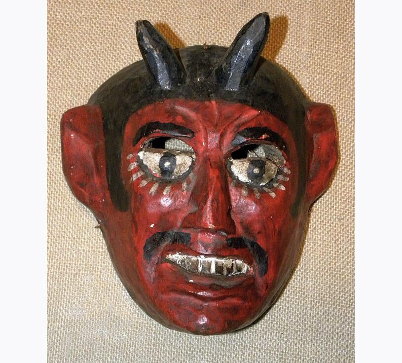 A life-sized square-shaped wood mask depicting a figure with a scarlet-red complexion. The hair is black and has two protruding black horns. The black eyes are painted into white semi-circles and outlined with white, painted lashes. Two cutout eyeholes for the wearer are under black eyebrows. A hooked nose is above a black parted mustache. The mouth is open and showing shaded white teeth. A wire is attached to the back of the mask. Signs of paint loss, dark residue over the mask, and a concentrated spot of paint loss on the right underside of the chin.Context