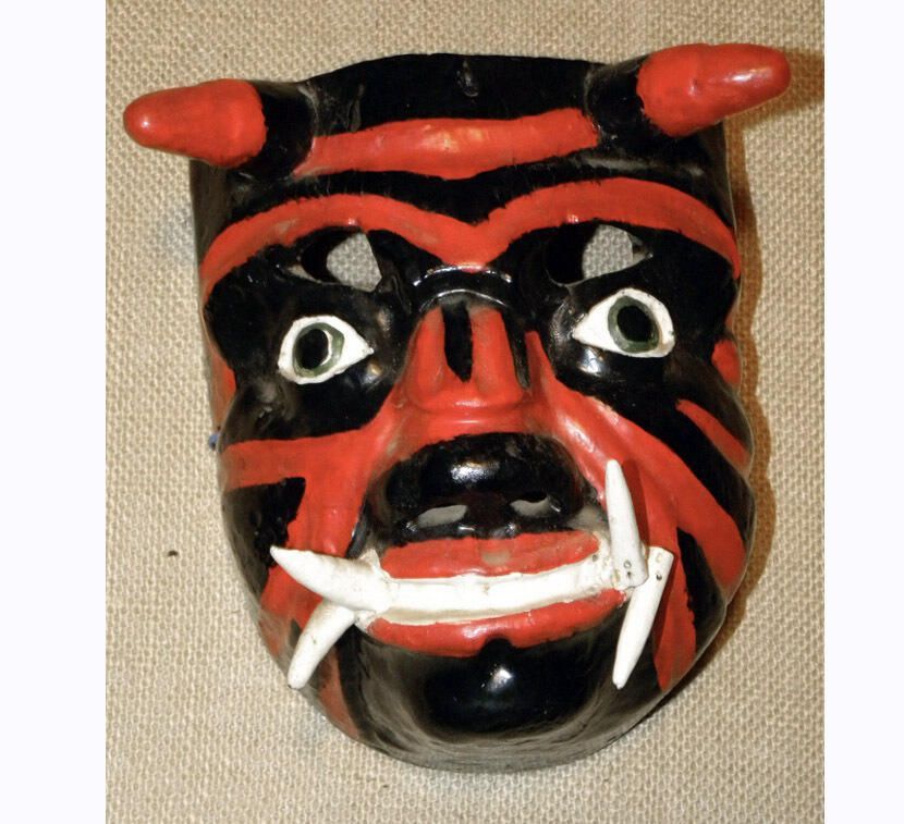 A life-sized square-shaped wood mask depicting a figure with a black complexion and red designs. Two horns with red tips protrude from the head. The black eyes are encircled with green and outlined with white. The cutout eyeholes for the wearer are above the eyes. A large nose with cutout nostrils is above the mouth showing white teeth and four long white tusks. A blue wire is attached to the back of the mask.Context