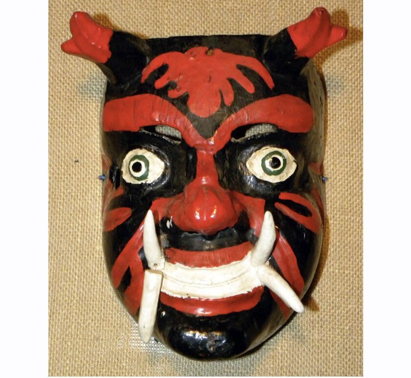 A life-sized rectangular wood mask depicting a figure with a black complexion and red designs, including a red organic shape on the forehead. Two horns with red tips protrude from the head. The black eyes are encircled with green and outlined with white. The cutout eyeholes for the wearer are above the eyes. A bumpy nose is above a smiling mouth with white teeth and four white tusks. A blue wire is attached to the back.Context