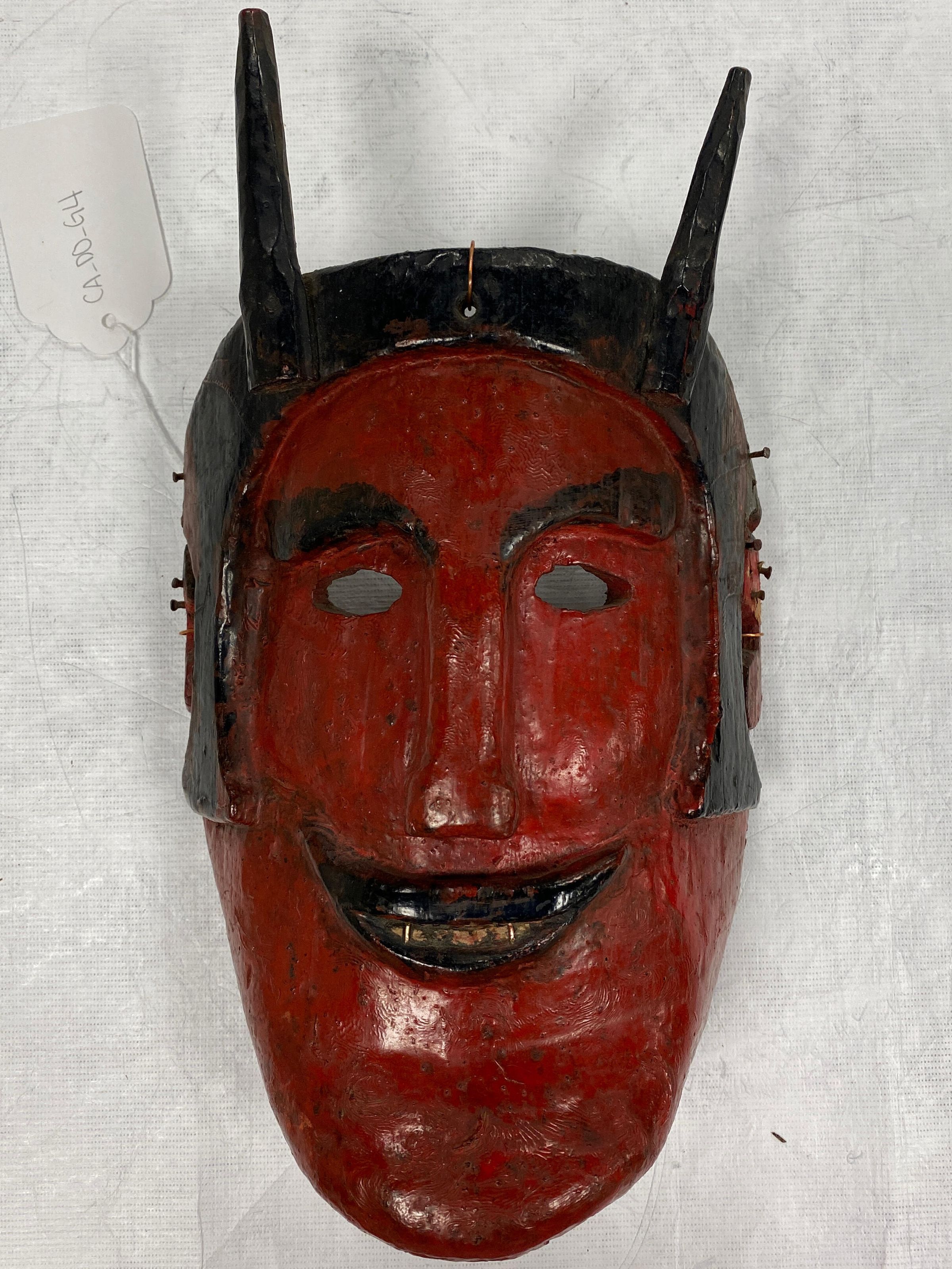 A life-sized oval wood mask depicting a man with a blood-red complexion. Black hair and two black horns are on the forehead. Black eyebrows are above cutout eyeholes. A long, flat nose is above a smiling black mouth and a large chin. Nails stick out from the ears. A wire is attached to the back of the mask. Some signs of paint loss and wood cracking.Context