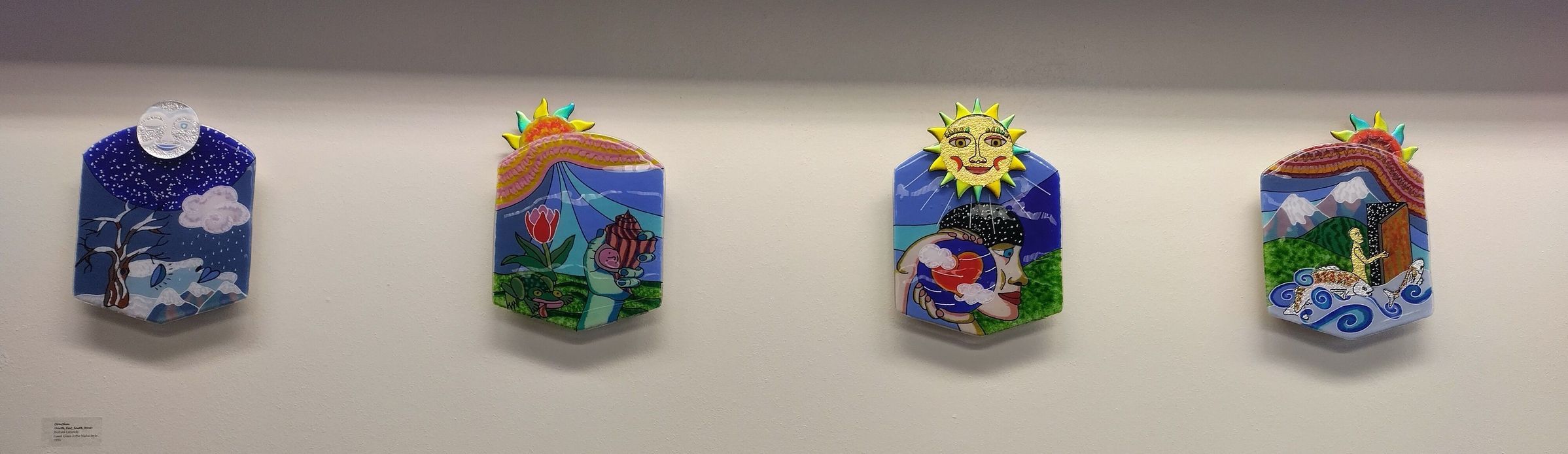 Series of 4 medium-sized rounded, hexagonal plates of fused glass with multicolored designs depicting a direction and season.