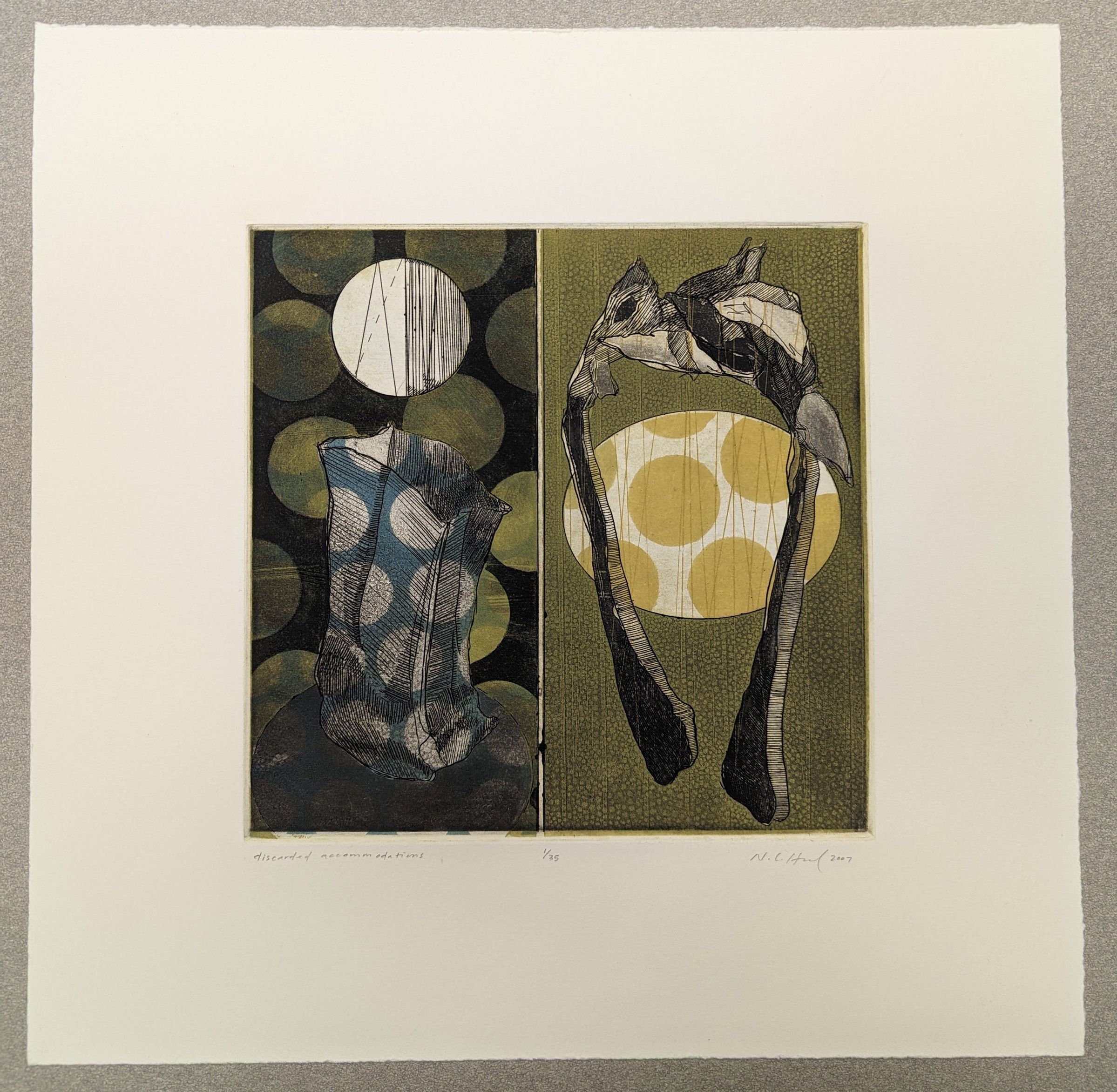 A medium square print with two vertically oriented plates. The left shows a blue paper back with white spots under a white circle, backgrounded by green spots over a black background. The right plate shows an arc of bundled paper or cardboard over a white circle with yellow spots, backgrounded by a field of dappled green.Context