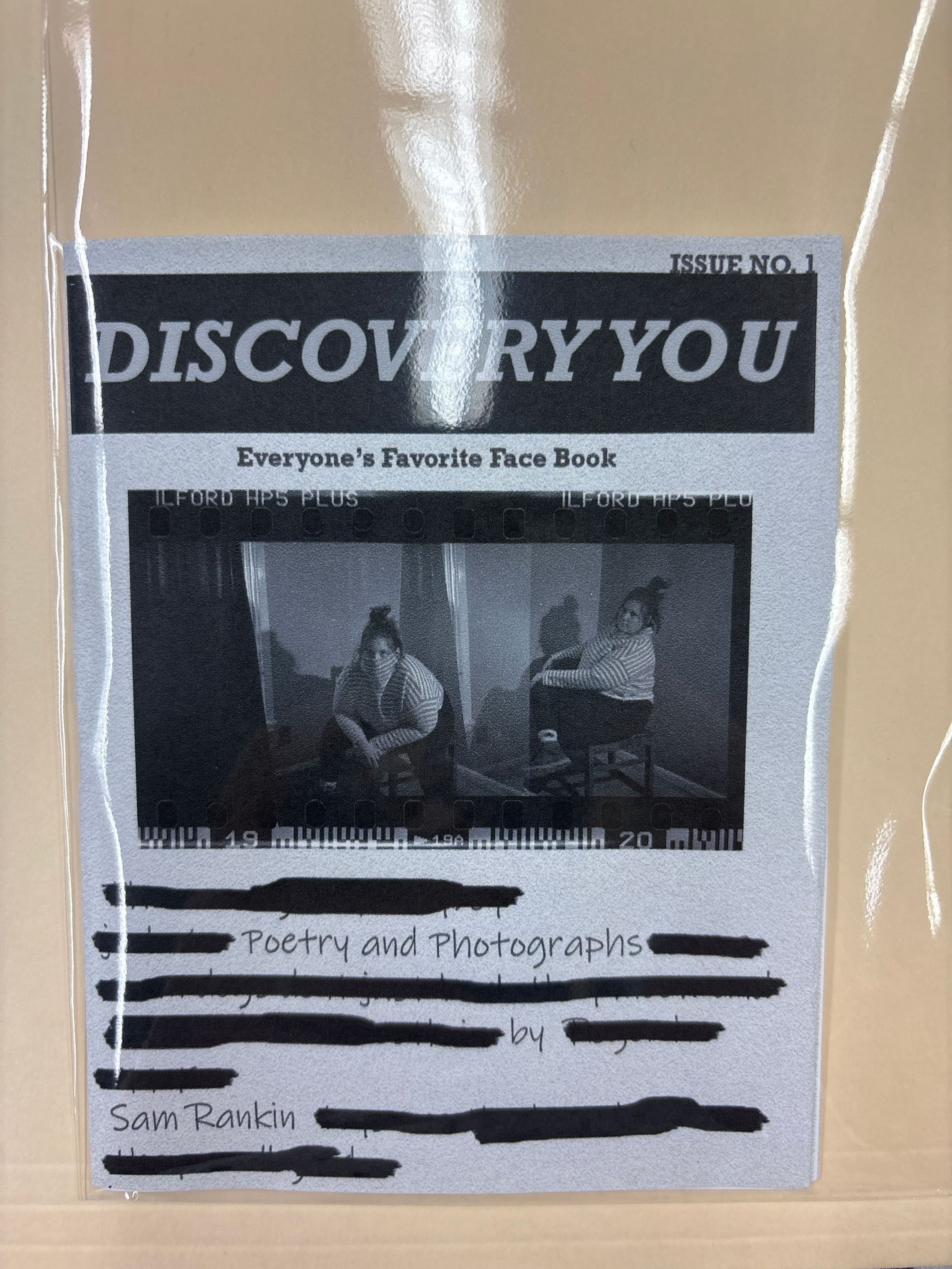 The small, vertically oriented Zine is monochromatic. It consists of black and white images with emotional text on the left pages.Collection